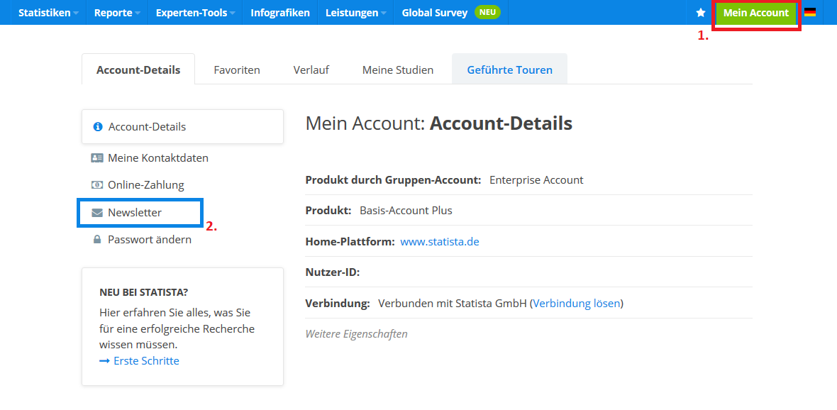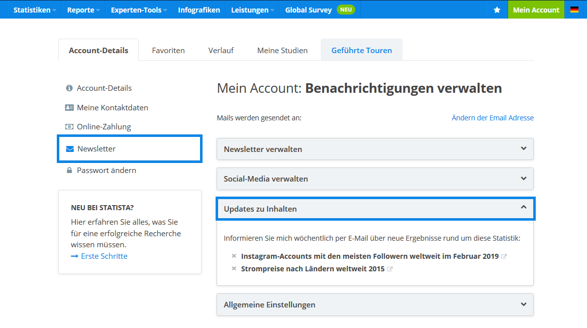 Verwalten können Sie Ihre abonnierten Statistik-Updates unter Mein Account im Menüpunkt Newsletter. Dort finden Sie eine Liste aller abonnierten Statistiken und können diese durch das Entfernen mit dem x links neben dem Statistik-Namen jederzeit wieder abbestellen.
