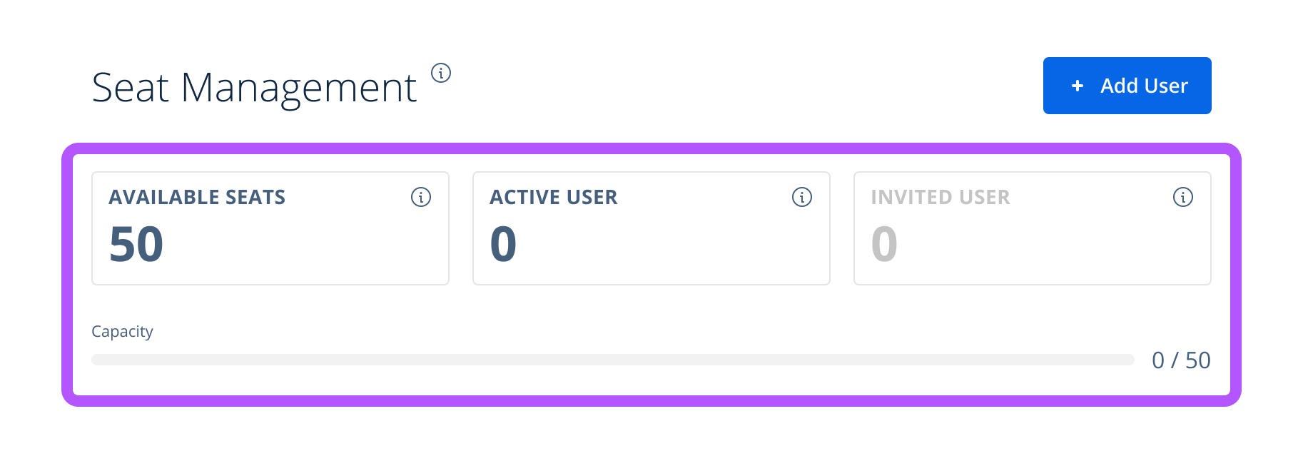 Ganz oben auf der Seite erhalten Sie eine klare Übersicht zur aktuellen Nutzung der Seats Ihres Accounts. Es werden drei Karten angezeigt: