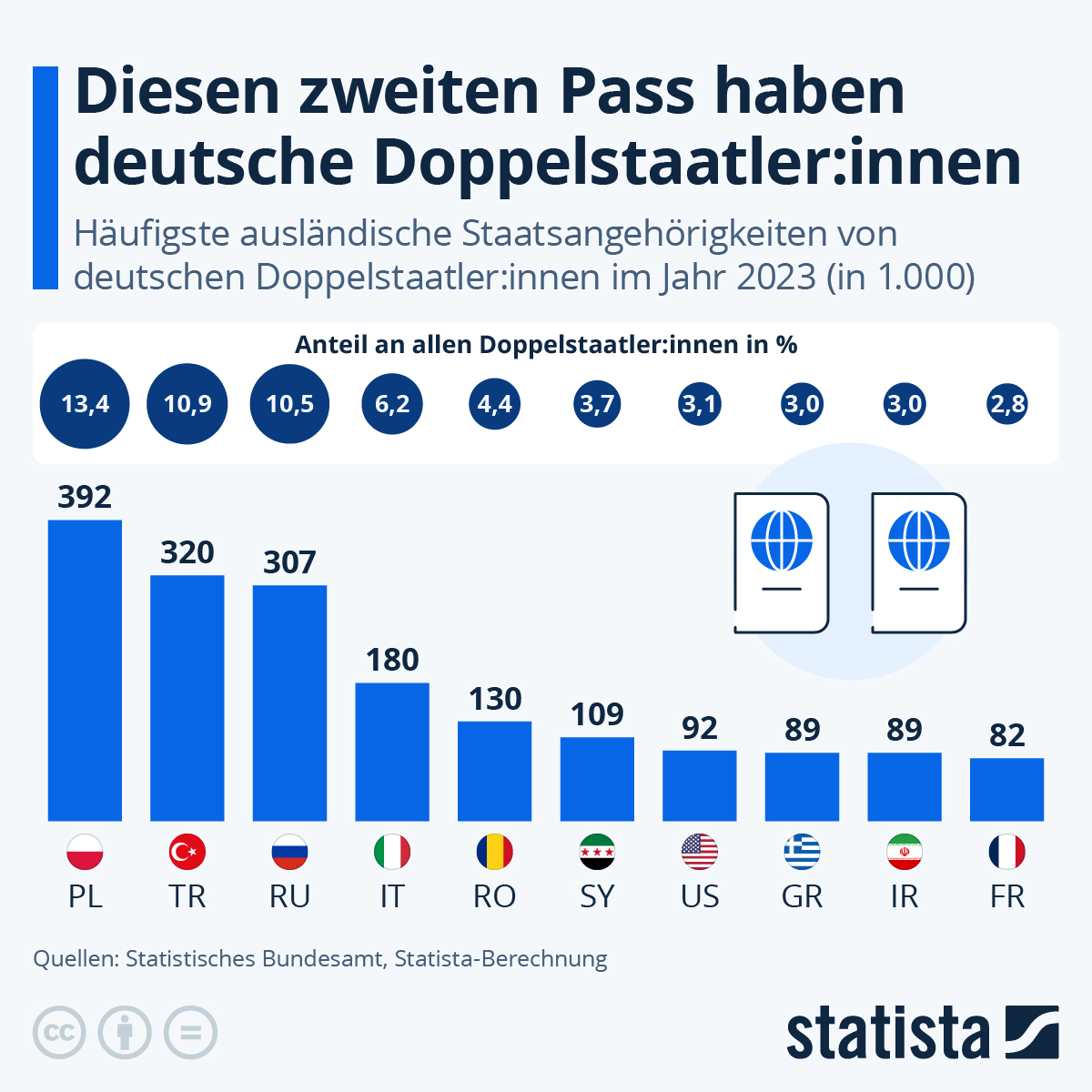 In Deutschland gibt es derzeit laut Mikrozensus des Statistischen Bundesamts rund 3 Millionen Menschen, die eine doppelte Staatsangehörigkeit besitzen. Darunter sind rund 392.000 Deutsche, die neben der deutschen auch die polnische Staatsbürgerschaft besaßen. Damit ist Polnisch die häufigste zweite Staatsbürgerschaft von deutschen Doppelstaatlern, der Anteil an der Gesamtzahl liegt bei 13,4 Prozent. Auf den Plätzen zwei und drei folgen die Türkei und Russland, der Anteil an der Gesamtzahl liegt liegt jeweils auch bei mehr als 10 Prozent.