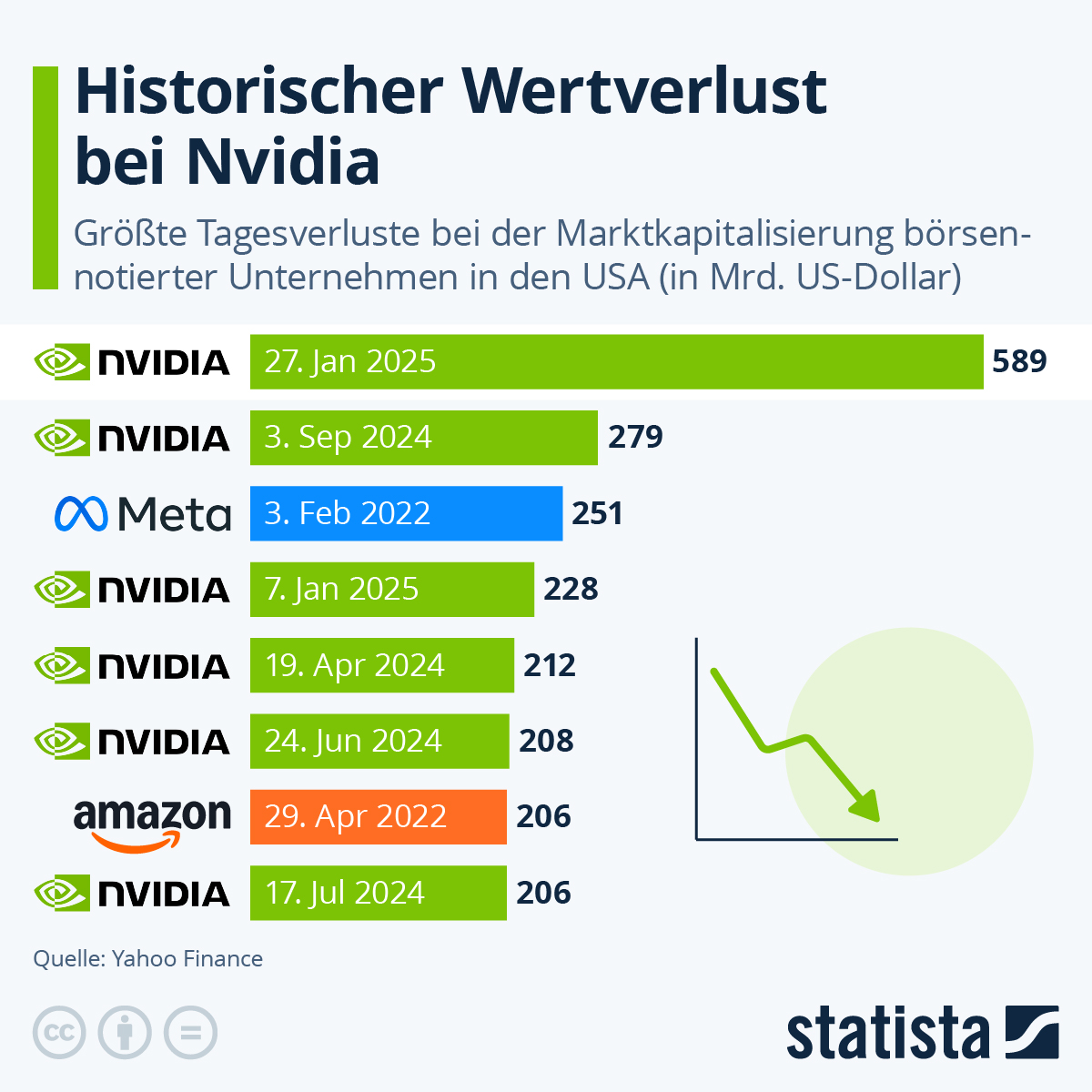 Für den Chiphersteller ist es indes nicht der erste dramatische Tagesverlust, wie der Blick auf die Statista-Grafik zeigt. Im vergangenen Jahr brach die Marktkapitalisierung von Nvidia ganze fünf Mal innerhalb eines Tages um über 200 Milliarden US-Dollar ein - zuletzt waren es am 3. September 2024 fast 280 Milliarden US-Dollar.