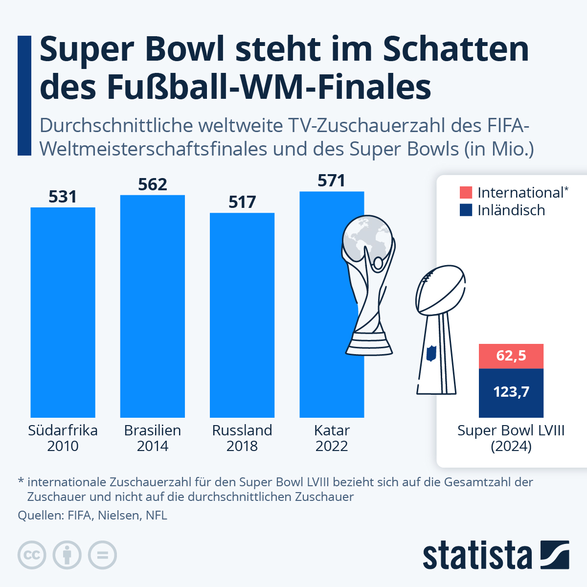 Nach Angaben der FIFA erreichte das WM-Finale 2022 zwischen Argentinien und Frankreich eine durchschnittliche Zuschauerzahl von 571 Millionen, wobei mehr als 1,4 Milliarden Menschen mindestens eine Minute des 120-minütigen Thrillers live verfolgten. Der Super Bowl 2024 verblasst im Vergleich dazu, obwohl er sowohl im Inland als auch international neue Zuschauerrekorde erzielt. Laut Nielsen erreichte Super Bowl LVIII eine durchschnittliche Zuschauerzahl von 123,7 Millionen in den USA und 62,5 Millionen im Ausland.