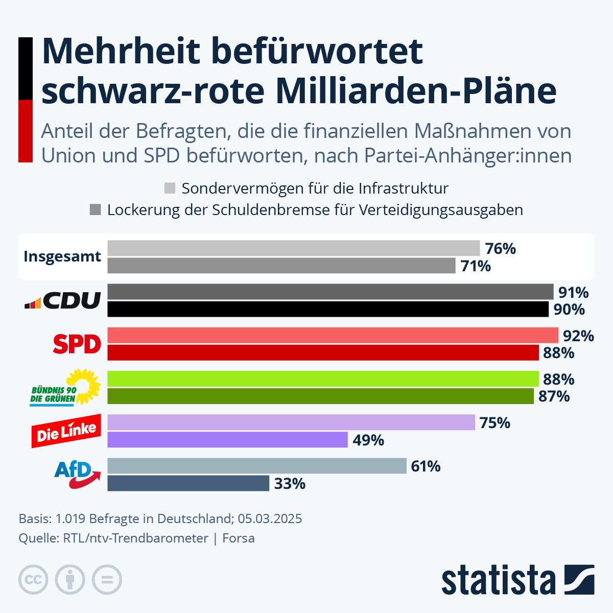 Demnach sind 76 Prozent der etwas mehr als 1.000 von Forsa befragten Menschen mit dem Sondervermögen einverstanden, bei den Anhänger:innen von Union und SPD sind es sogar jeweils über 90 Prozent. Auch ansonsten ist die Zustimmung groß. lediglich bei den AfD-Unterstützer:innen sind es "nur" 61 Prozent.