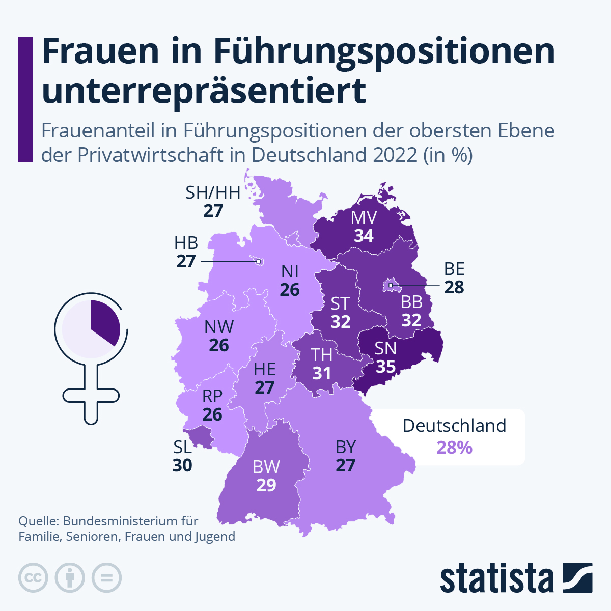 Von den Top-Führungspositionen der Privatwirtschaft in Deutschland waren 2022 laut Bundesministerium für Familie, Senioren, Frauen und Jugend 28 Prozent mit Frauen besetzt. Dabei zeigen die Daten, dass es bei Führungspositionen der obersten Ebene bezüglich der Geschlechterverteilung sichtbare Unterschiede zwischen den alten und den neuen Bundesländern gibt.