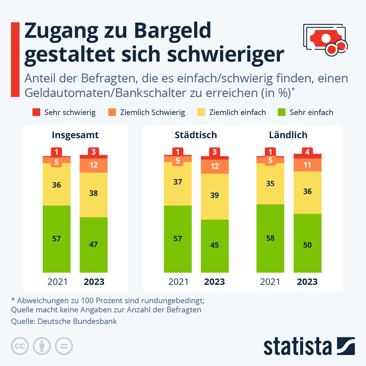 Im Jahr 2021 sagten 93 Prozent der im Auftrag der Deutschen Bundesbank befragten Menschen, dass sie es sehr oder ziemlich einfach finden, den nächsten Geldautomaten oder Bankschalter zu erreichen. Zwei Jahre später ist dieser Wert auf 85 Prozent gefallen.