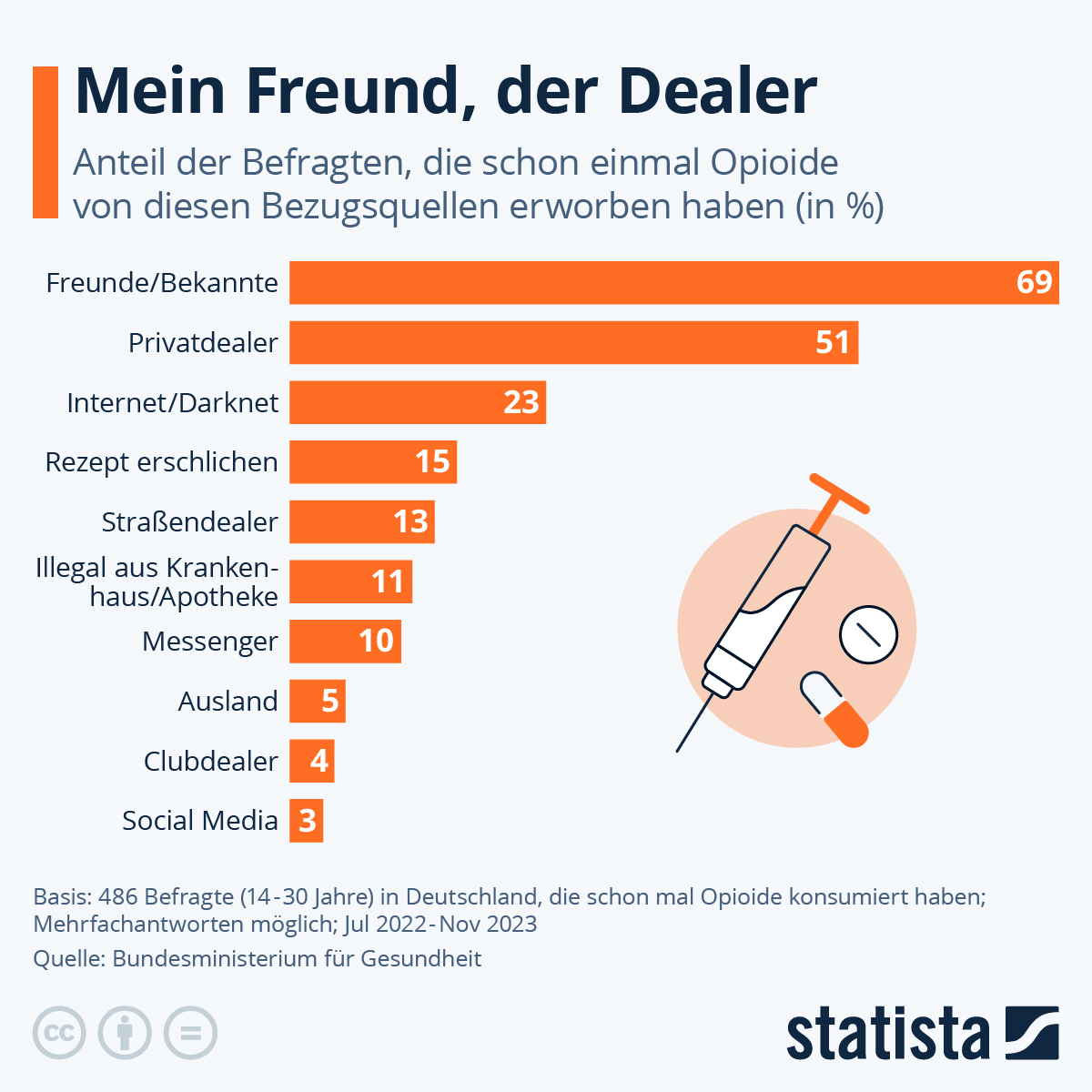 Wenn es um die Beschaffung von Opioiden geht, setzen deutsche Konsument:innen in erster Linie auf den Freundeskreis. Das zeigt eine Befragung des Bundesgesundheitsministeriums unter 486 Opioid-Konsument:innen. Demnach haben rund 69 Prozent der Befragten angegeben schon einmal Opioide oder opioidhaltige Medikamente von Freunden oder Bekannten erworben zu haben.