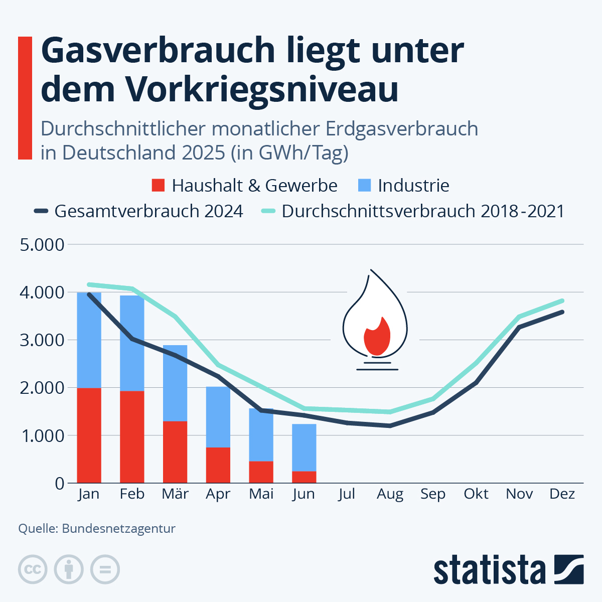 Der Gasverbrauch in Deutschland liegt weiter unter dem Niveau der Jahre vor der Energiekrise. Das zeigen aktuelle Daten der Bundesnetzagentur. Im ersten Halbjahr 2025 lag der durchschnittliche tägliche Gasverbrauch in allen Monaten unter dem Mittelwert der Jahre 2018 bis 2021 – teils deutlich.