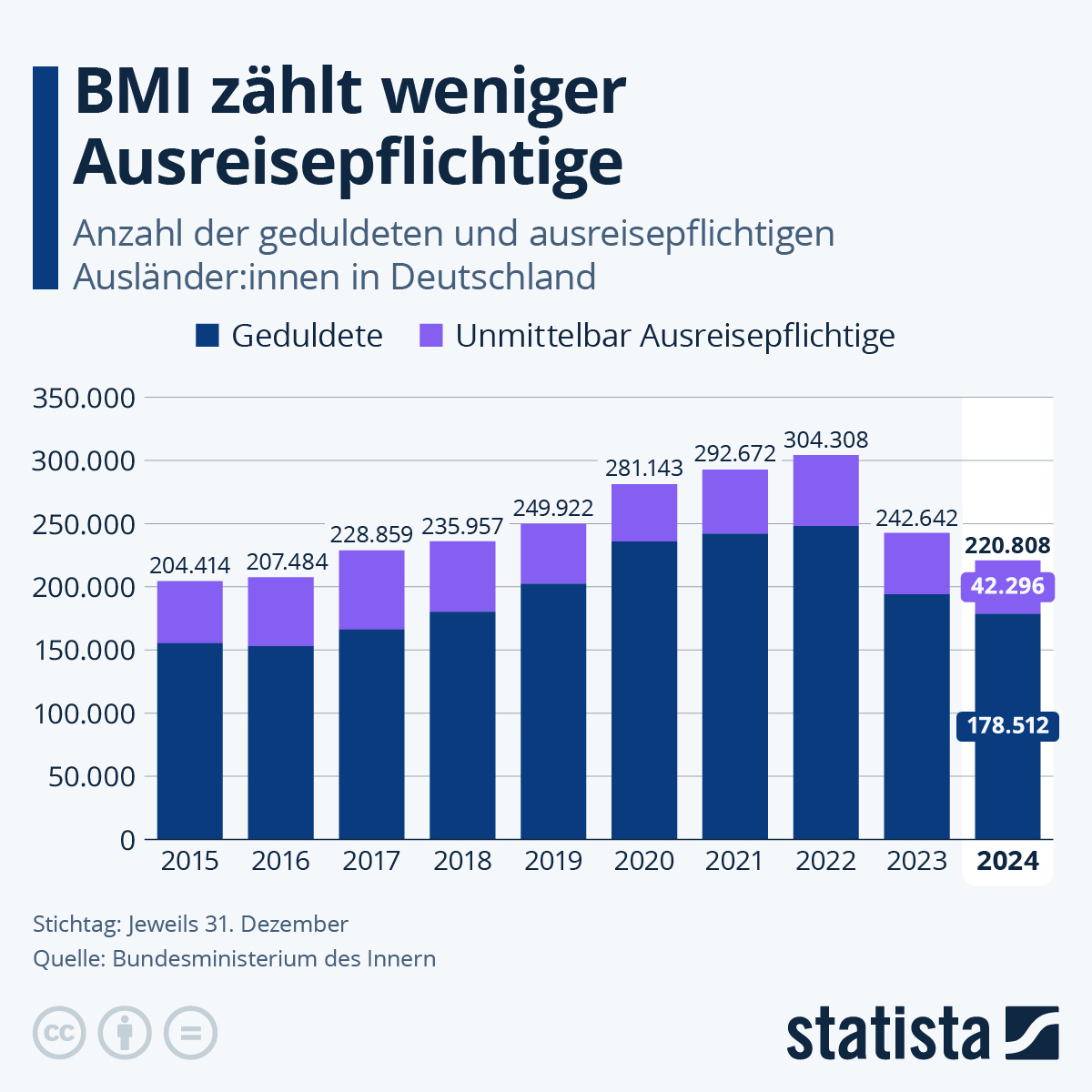 Die Zahl der ausreisepflichtigen Ausländer:innen in Deutschland ist im Jahr 2024 deutlich zurückgegangen. Laut Daten des Bundesministeriums des Innern lebten zum Stichtag 31. Dezember 2024 rund 220.800 Personen ohne entsprechenden Aufenthaltstitel in Deutschland – ein Rückgang um über 80.000 gegenüber dem Rekordwert aus dem Jahr 2022. Damit liegt die Zahl auf dem niedrigsten Stand seit 2016.
