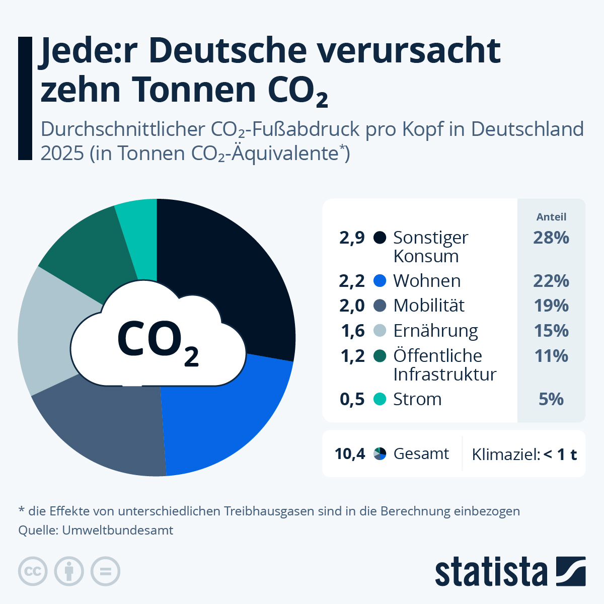 Der durchschnittliche CO₂-Fußabdruck pro Person in Deutschland liegt im Jahr 2025 bei rund 10,4 Tonnen CO₂-Äquivalenten. Das zeigt eine aktuelle Berechnung des Umweltbundesamtes, die verschiedene Lebensbereiche berücksichtigt.