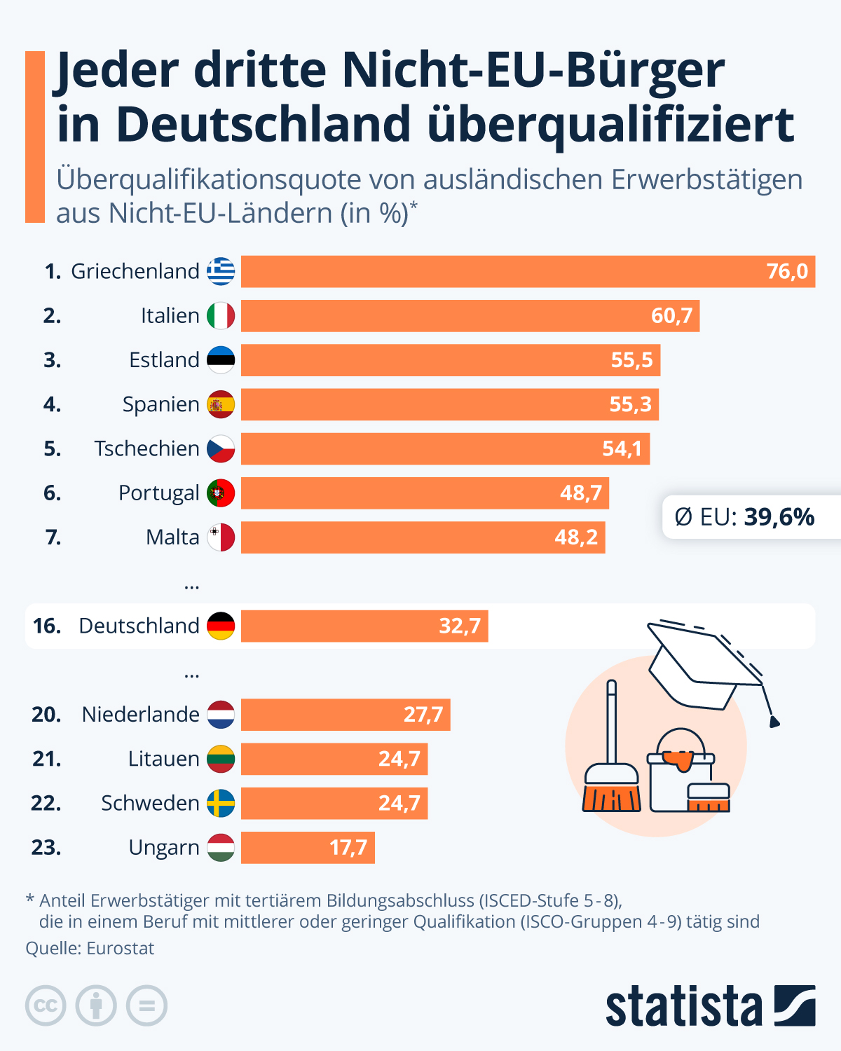 Besonders hoch sind die Überqualifikationsquoten in Griechenland (76 Prozent) und Italien (60,7 Prozent). Ungarn weist mit 17,7 Prozent die geringste Quote auf. Deutschland liegt mit rund 33 Prozent zwar unter dem EU-Durchschnitt von rund 40 Prozent. Gleichwohl gibt es auch hier noch deutlichen Nachholbedarf bei der Integration von ausländischen Erwerbstätigen. Darauf weist auch eine jüngst veröffentlichte Erhebung der Universtität Siegen hin. Diese zeigt, dass Bewerber mit ausländischem Namen in Bewerbungsverfahren seltener eine Antwort erhalten.