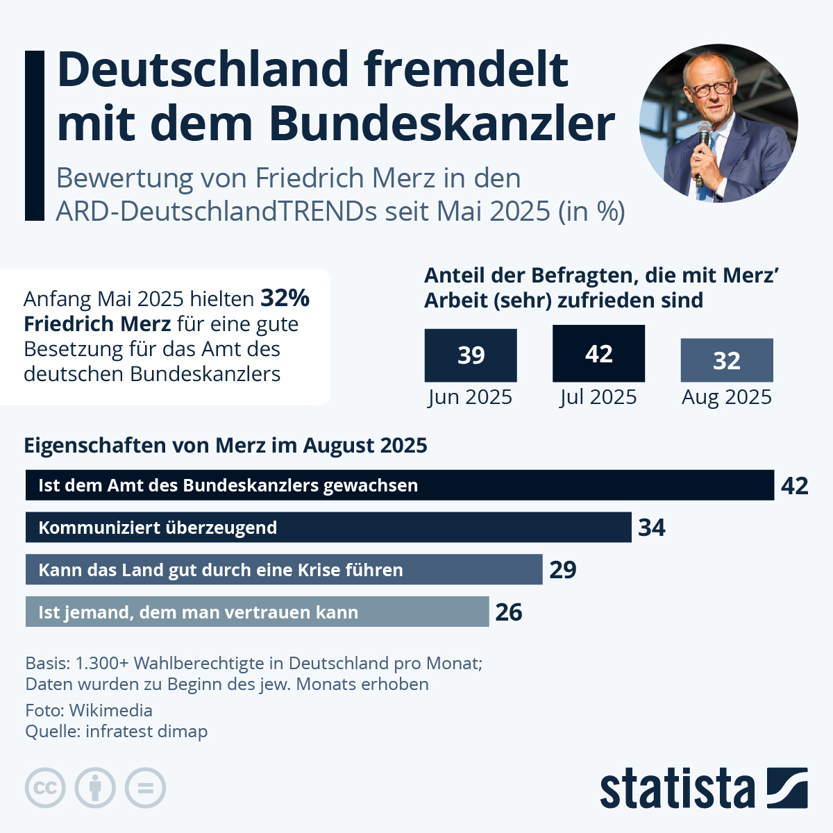 Die von infratest dimap regelmäßig erhobene Umfrage zeigt, dass Deutschland mit seinem Bundeskanzler von Beginn an gefremdelt hat. So hielt Anfang Mai nur jeder dritte Wahlberechtigte Merz für eine gute Besetzung für das Amt des Bundeskanzlers. Einen Monat später lag der Anteil der Befragten, die mit der Arbeit des CDU-Politikers sehr zufrieden oder zufrieden war bei 39 Prozent, ein Wert der im Juli leicht steigen und im August dann deutlich fallen sollte, wie der Blick auf die Statista-Grafik zeigt.