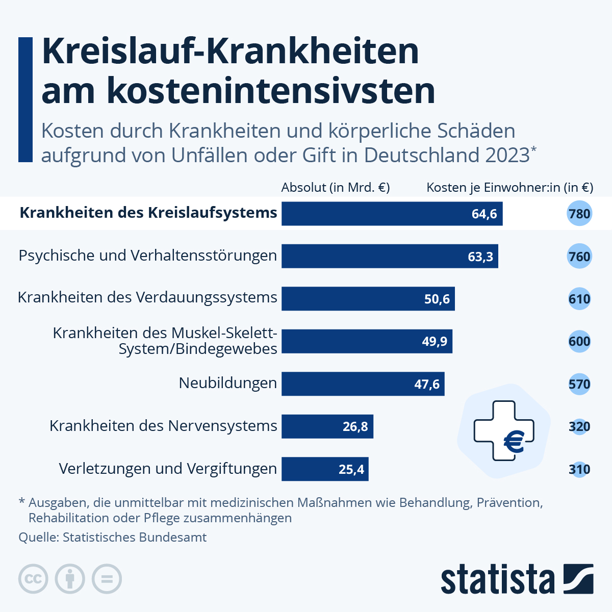 Die Krankheitskostenrechnung weist die direkten Krankheitskosten nach Alter, Geschlecht und Einrichtungen des Gesundheitswesens nach. Zu den Kosten zählen die unmittelbar mit einer medizinischen Heilbehandlung, Präventions-, Rehabilitations- oder Pflegemaßnahme verbundenen Ausgaben.