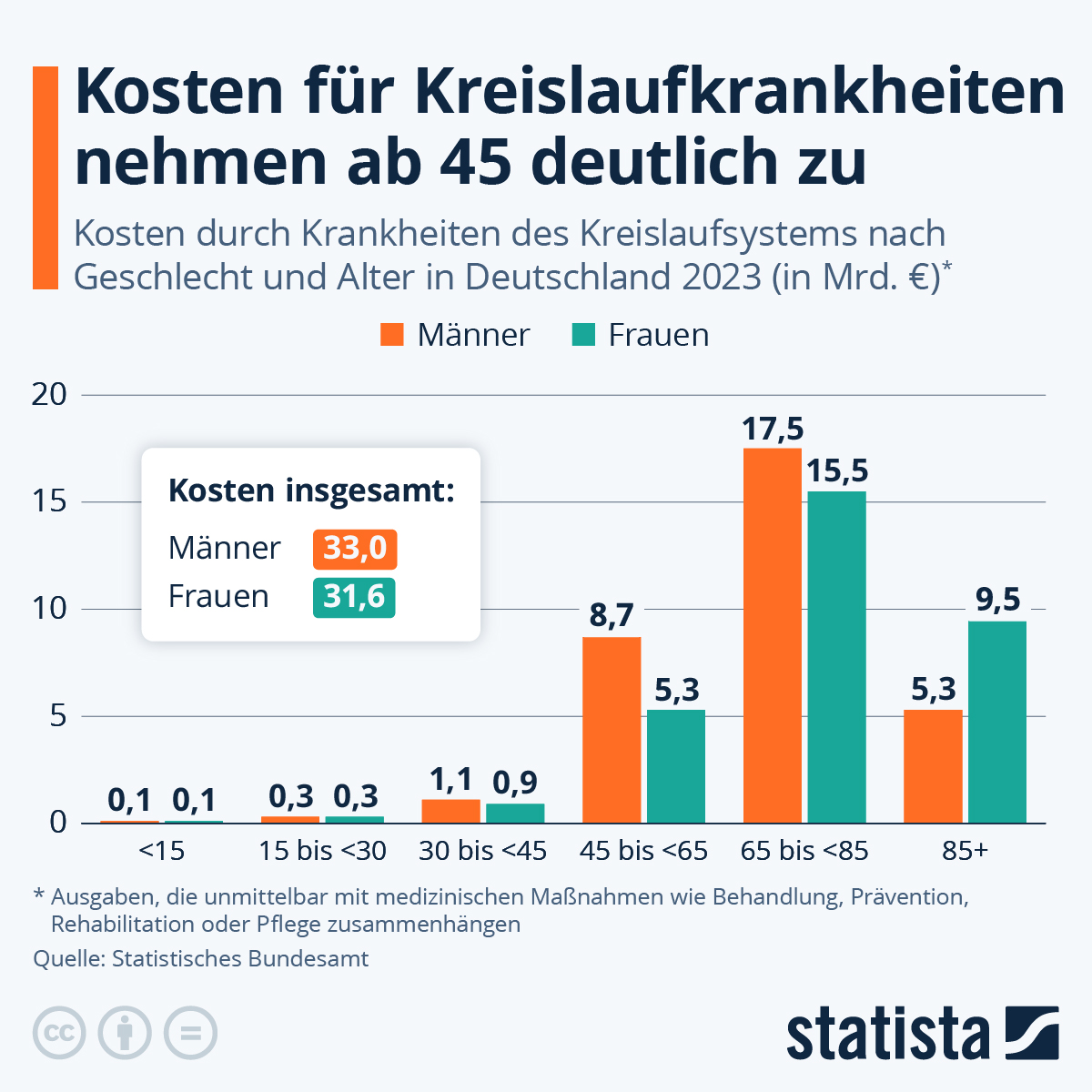 In der Altersspanne von 45 bis unter 65 Jahre nehmen die Kosten durch Krankheiten des Kreislaufsystems deutlich zu. Das zeigen aktuelle Daten des Statistischen Bundesamts. Gegenüber der Altersspanne von 30 bis unter 45 Jahre kommt es bei Männern ungefähr zu einer Verachtfachung der Kosten, bei Frauen liegen die Kosten über fünf Mal so hoch. Dies deckt sich mit bekannten Risikofaktoren wie Bluthochdruck, Übergewicht, Rauchen oder beruflichem Stress.