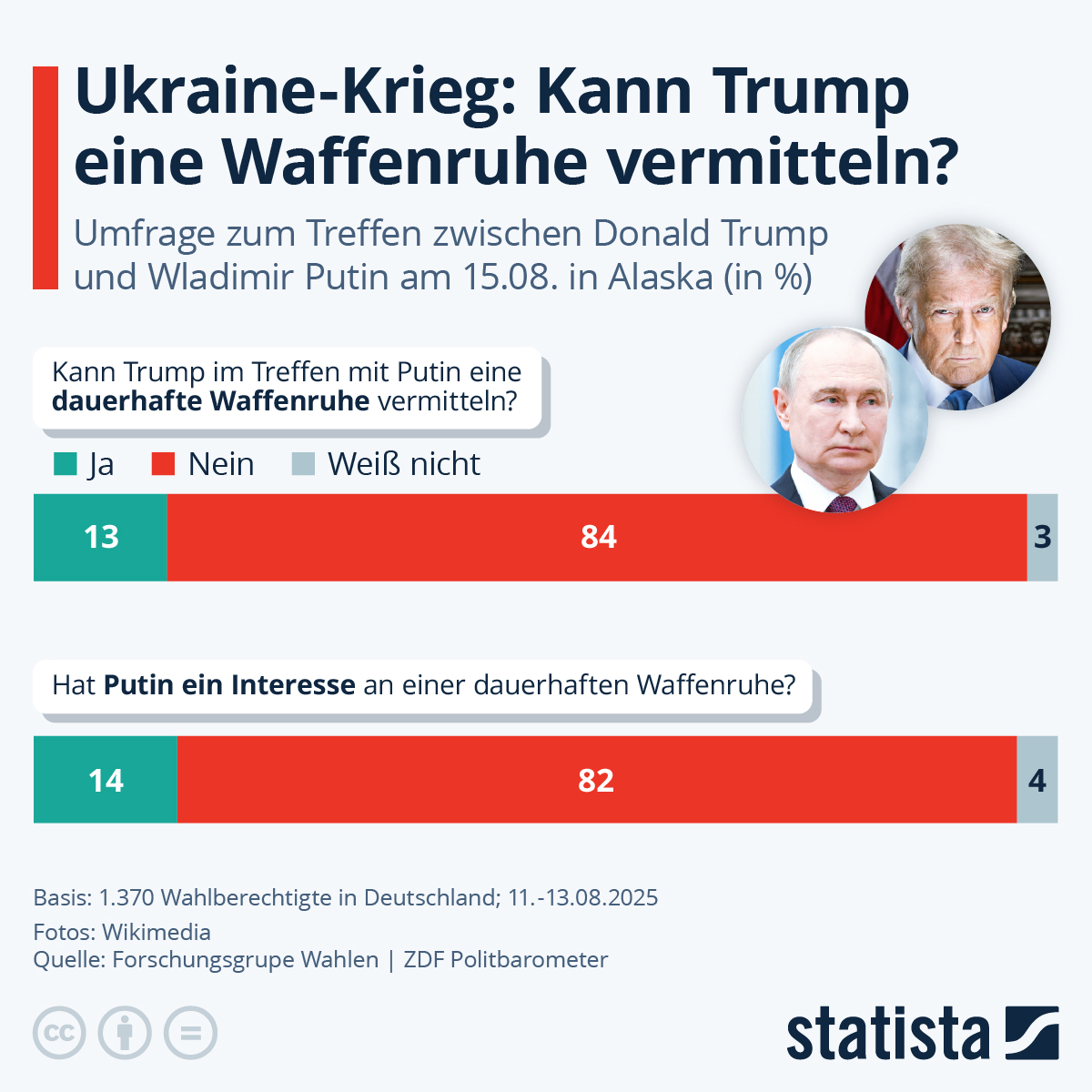 Vor seinem mit Spannung erwarteten Gipfel mit dem russischen Staatschef Wladimir Putin zum Ukraine-Krieg hat US-Präsident Donald Trump die Erwartungen gedämpft und auf die Möglichkeit eines Scheiterns der Gespräche verwiesen. Mit einem Scheitern rechnet auch die deutliche Mehrheit der Bevölkerung in Deutschland: Laut einer Umfrage des ZDF Politbarometers haben 84 Prozent der Befragten angegeben, dass sie nicht denken, dass Trump im Treffen mit Putin eine dauerhafte Waffenruhe vermitteln kann. Zudem denken 82 Prozent der Befragten, dass Putin kein Interesse an einer solchen Waffenruhe hat.