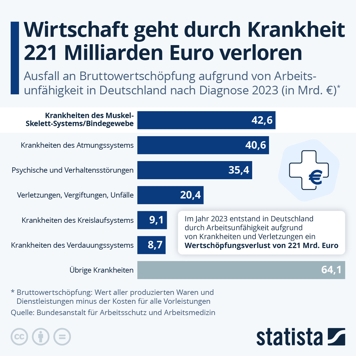 Wenn Arbeitnehmer durch Krankheit ausfallen, sinkt die wirtschaftliche Leistung, weil weniger Güter und Dienstleistungen produziert werden. Die höchsten Ausfälle an Bruttowertschöpfung verursachten im Jahr 2023 Erkrankungen des Muskel-Skelett-Systems und des Bindegewebes mit 42,6 Milliarden Euro. Das zeigt die Statista-Grafik mit Daten der Bundesanstalt für Arbeitsschutz und Arbeitsmedizin (PDF-Download). Dahinter folgten Krankheiten des Atmungssystems mit 40,6 Milliarden Euro sowie psychische und Verhaltensstörungen mit 35,4 Milliarden Euro. Die übrigen Krankheiten machten mit 64,1 Milliarden Euro zwar den größten Einzelwert aus, bilden jedoch eine sehr heterogene Sammelkategorie und lassen sich keiner spezifischen Diagnosegruppe zuordnen.