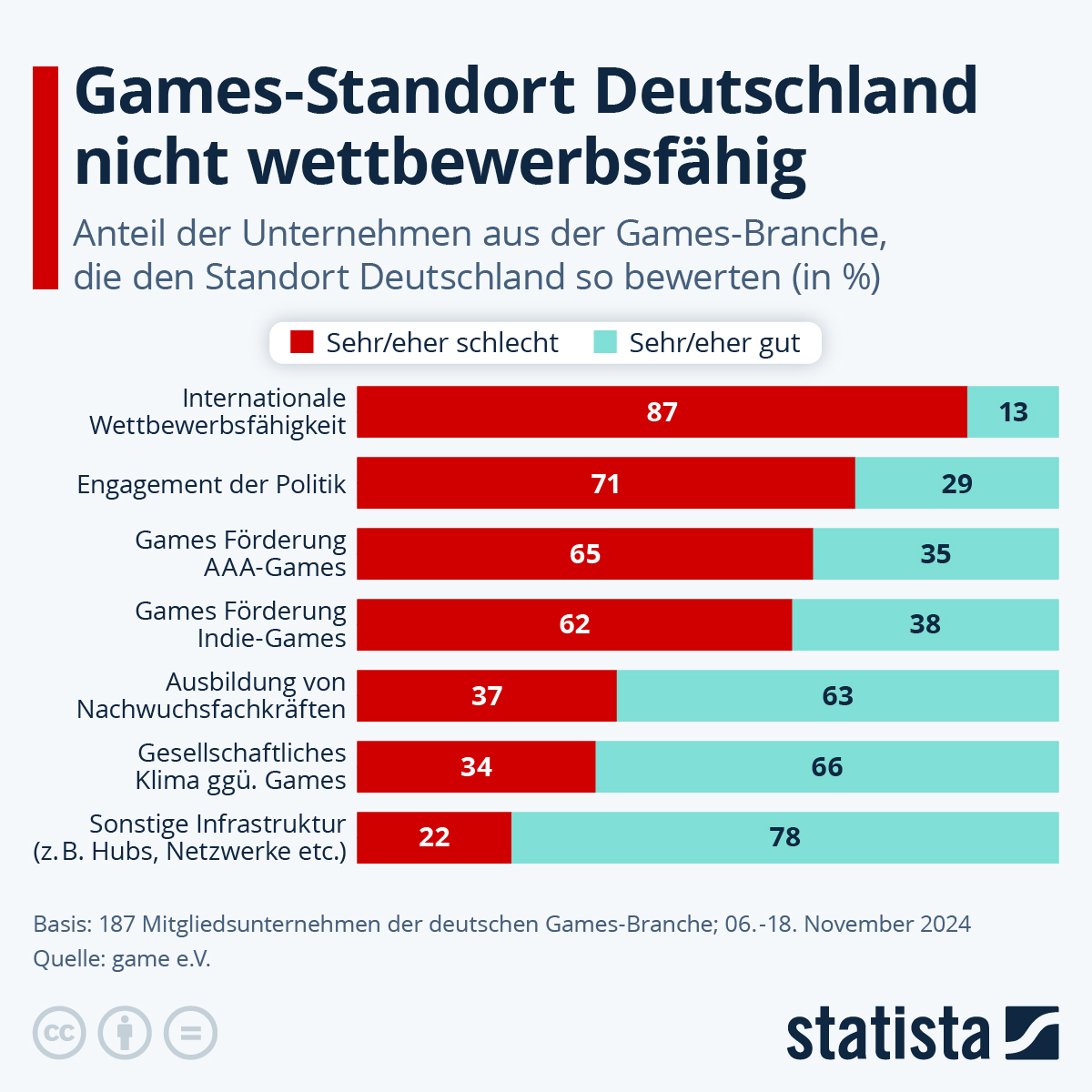 Die Ergebnisse spiegeln die politische Vernachlässigung eines starken Absatzmarktes mit viel unausgeschöpften Potenzial wider. In den vergangenen Monaten kam es in der weltweiten Games-Industrie immer wieder zu Standortschließungen und Entlassungswellen, darunter auch bei internationalen Studios mit deutschen Niederlassungen. Gründe sind neben der Förderpolitik auch hohe Produktionskosten, Fachkräftemangel und eine im internationalen Vergleich geringe Marktdynamik.