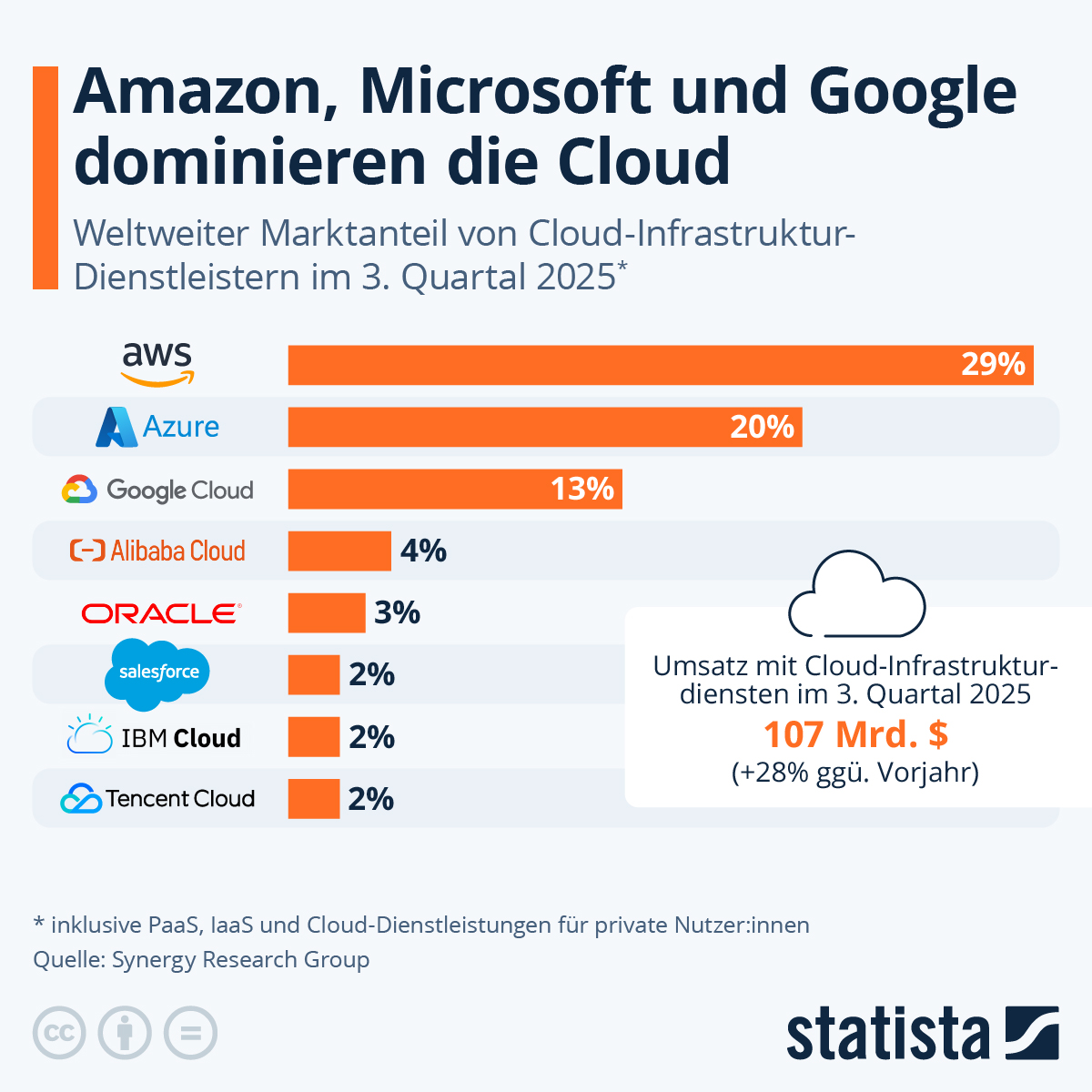 Der langjährige Cloud-Marktführer Amazon Web Services (AWS) liegt auch im dritten Quartal 2025 an der Spitze. Schätzungen der Synergy Research Group zufolge kommt AWS auf einen Marktanteil von rund 29 Prozent. Dahinter folgen die Microsoft-Plattform Azure mit 20 Prozent und die Google Cloud mit 13 Prozent. Zusammen kommen die „Big 3“ auf mehr als 60 Prozent des kontinuierlich wachsenden Cloud-Marktes, während der Rest der Konkurrenz lediglich im niedrigen einstelligen Bereich liegt. Insgesamt sind sind die weltweiten Ausgaben für Cloud-Infrastruktur-Dienste von Juli bis September gegenüber dem Vorjahr um 28 Prozent auf 107 Milliarden US-Dollar gestiegen. Auf das Gesamtjahr hochgerechnet dürften es über 4000 Milliarden US-Dollar werden.