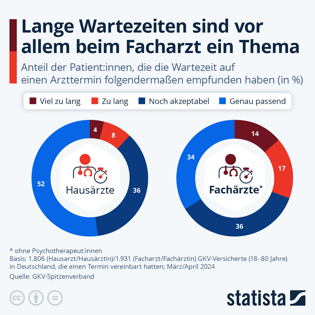 Viele Menschen empfinden die Wartezeiten auf einen Termin bei Haus- oder Facharzt als zu lang. Eine Studie im Auftrag des GKV-Spitzenverbands, der nach eigenen Angaben zentralen Interessenvertretung der gesetzlichen Kranken- und Pflegekassen in Deutschland, bestätigt diese Wahrnehmung nur teilweise. Demnach sagen zwölf Prozent der befragten gesetzlich Versicherten, dass sie auf Termine bei ihrem Hausarzt oder ihrer Hausärztin zu lang oder viel zu lang warten müssen. Dagegen empfinden über 50 Prozent die Wartezeit als optimal, weitere 36 Prozent erachten sie als angemessen. Etwas anders sieht bei der fachärztlichen Versorgung aus. Hier sagen fast ein Drittel, dass es (viel) zu lange dauert, bis sie ihr medizinisches Problem abklären können. Aber auch hier empfindet die Mehrheit der Befragten, die Wartezeit als angemessen oder sogar optimal.