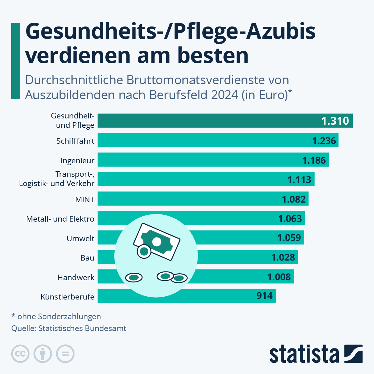 Wie viel Auszubildende verdienen, hängt vom Beruf ab, den sie erlernen. Überdurchschnittlich verdienten im Jahr 2024 Auszubildende in Gesundheits- und Pflegeberufen. Ihr Monatsverdienst lag im Schnitt bei 1.310 Euro brutto. Ausbildungen in Schifffahrtberufen, wie etwa zur Schiffbauerin und zum Schiffbauer, wurden mit 1.236 Euro brutto im Monat ebenfalls hoch vergütet. Im Handwerk verdienten Auszubildende im Durchschnitt 1.008 Euro brutto im Monat. Die geringste Vergütung erhielten Auszubildende in Künstlerberufen: Auszubildende in Bereichen wie beispielsweise Musik, Fotografie oder Grafikdesign hatten einen monatlichen Bruttoverdienst von durchschnittlich 914 Euro.