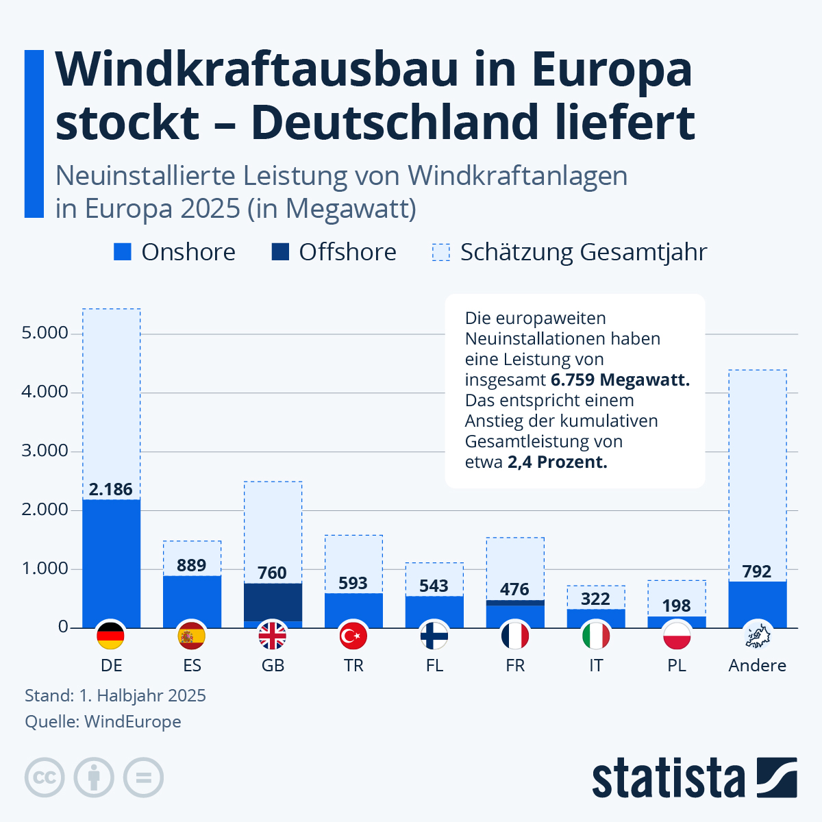 Trotz ambitionierter Klimaziele kommt der Ausbau der Windenergie in Europa nur schleppend voran. Laut dem aktuellen Herbstbericht von WindEurope wurden im ersten Halbjahr 2025 europaweit lediglich 6.759 Megawatt neu installiert – ein Zuwachs von gerade einmal 2,4 Prozent zur der kumulierten Gesamtleistung.