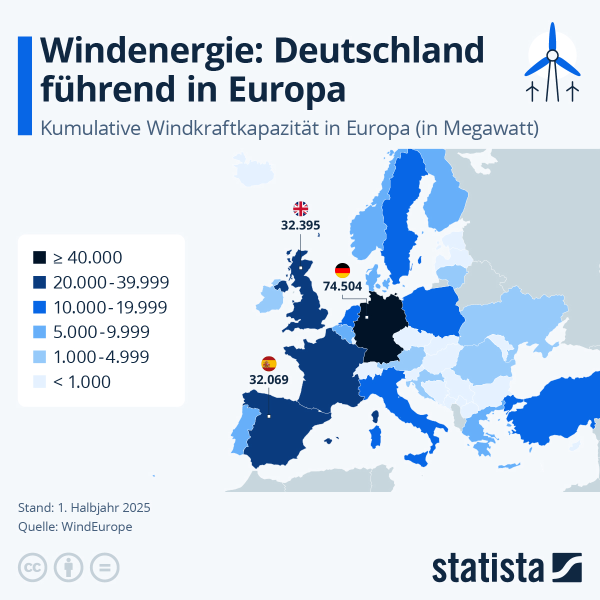 Europa hat ambitionierte Ziele beim Ausbau der Windenergie – doch die Realität hinkt hinterher. Laut aktuellen Daten von WindEurope für das erste Halbjahr 2025 liegt die neuinstallierte Windkraftleistung in vielen Ländern deutlich unter den Erwartungen. Blickt man auf die kumulative Gesamtkapazität der Länder, bleibt Deutschland mit über 74 Gigawatt installierter Leistung zwar unangefochtene Nummer eins. Großbritannien (32,4 GW) und Spanien (32,1 GW) folgen erst mit großem Abstand.
