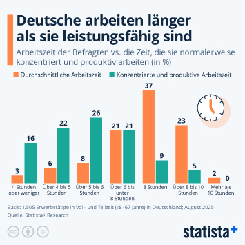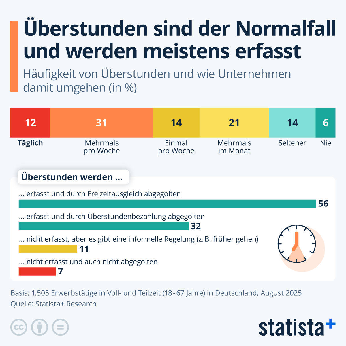 Nur sechs Prozent der Beschäftigten machen nie Überstunden, wie eine Erhebung von Statista+ zeigt. Dagegen ist Mehrarbeit für das Gros der Werktätigen normaler Bestandteil einer Arbeitswoche. Bei zwölf Prozent der Befragten kommen Überstunden sogar täglich vor, bei weiteren 31 Prozent mehrmals pro Woche. Immerhin erfassen Unternehmen die zusätzliche Arbeit in der Regel, wie der Blick auf die Statista-Grafik zeigt. Über die Hälfte der Arbeitnehmer:innen geben an, dass Überstunden erfasst und durch Freizeitausgleich abgegolten werden, ein weiteres Drittel gibt an, dass sie erfasst und bezahlt werden. Bei elf Prozent der Befragten wird Mehrarbeit zwar nicht erfasst, aber im Rahmen informeller Regelungen (z. B. früher gehen) kompensiert. Davon unabhängig bleibt eine hohe Arbeitsbelastung aber nicht folgenlos.