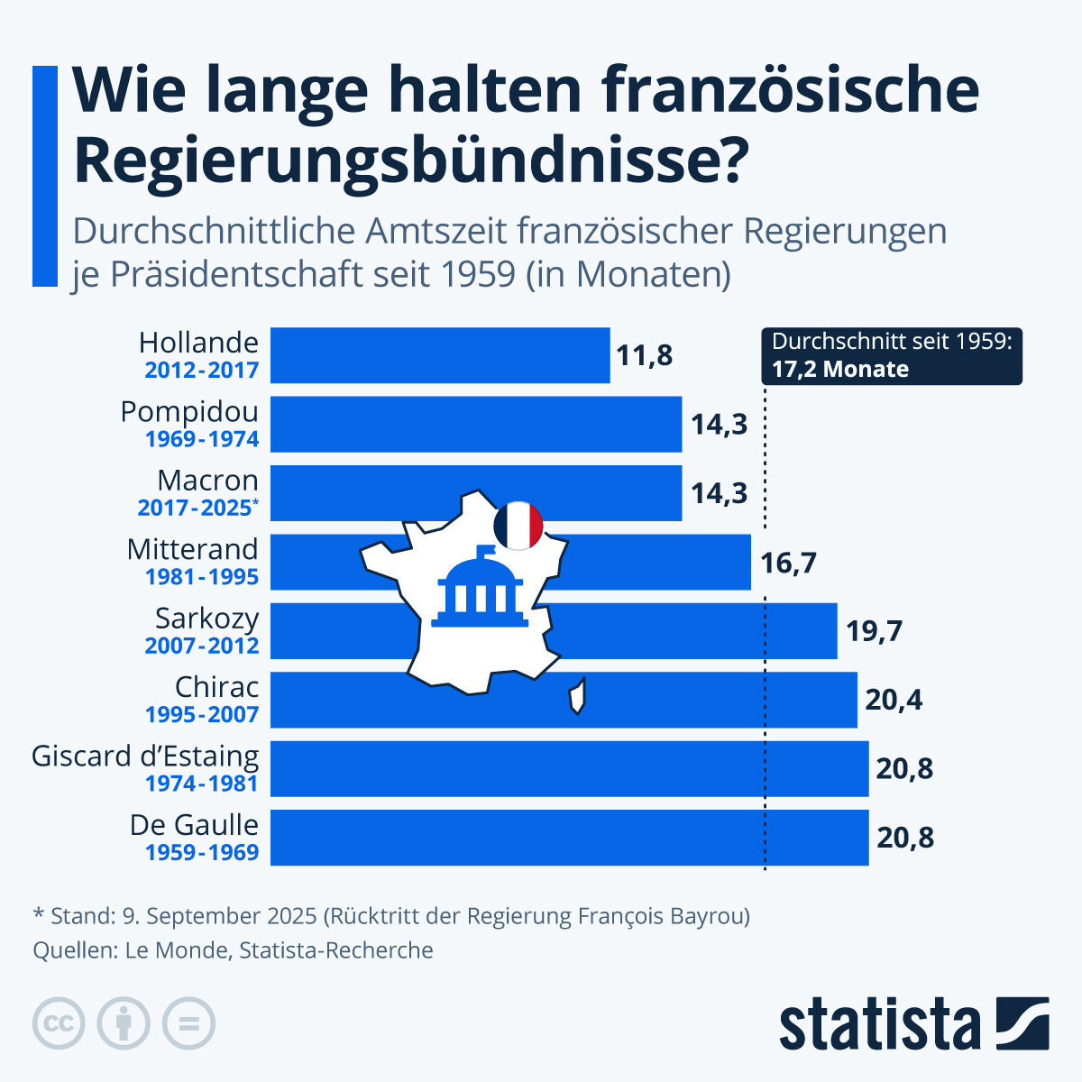 Frankreich steht erneut vor einer Regierungskrise: Premierminister François Bayrou ist nach einem Misstrauensvotum zurückgetreten – das siebte Kabinett unter Präsident Emmanuel Macron seit 2017 ist damit Geschichte. Die durchschnittliche Regierungsdauer unter Macron beträgt nur 14,3 Monate, deutlich unter dem historischen Mittelwert von 17,2 Monaten seit Beginn der Fünften Republik im Jahr 1959.