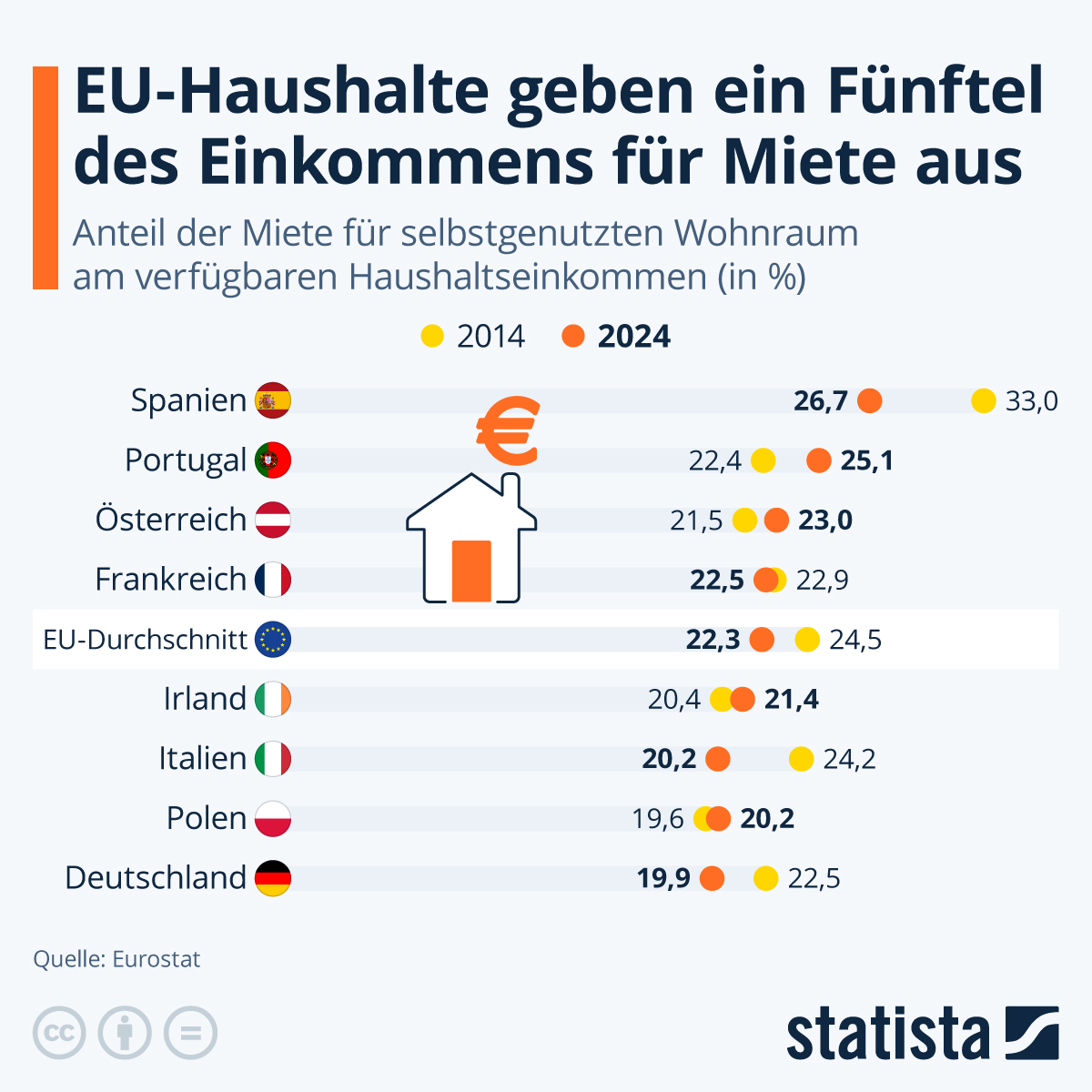 Im EU-Durchschnitt sank der Anteil der Miete am verfügbaren Einkommen von 24,5 Prozent im Jahr 2014 auf 22,3 Prozent im Jahr 2024. In Deutschland liegt der Wert aktuell bei 19,9 Prozent – ein leichter Rückgang gegenüber 2014 (22,5 Prozent), aber weiterhin auf hohem Niveau. In Österreich stieg der Anteil sogar von 21,5 Prozent auf 23 Prozent. Auch in Portugal ist die Mietbelastung deutlich gestiegen (von 22,4 Prozent auf 25,1 Prozent). In Spanien hingegen ist der Anteil von 33 Prozent auf 26,7 Prozent gesunken, bleibt aber im europäischen Vergleich hoch. Frankreich, Italien, Irland und Polen bewegen sich mit Anteilen zwischen 20 und 22 Prozent im Mittelfeld.