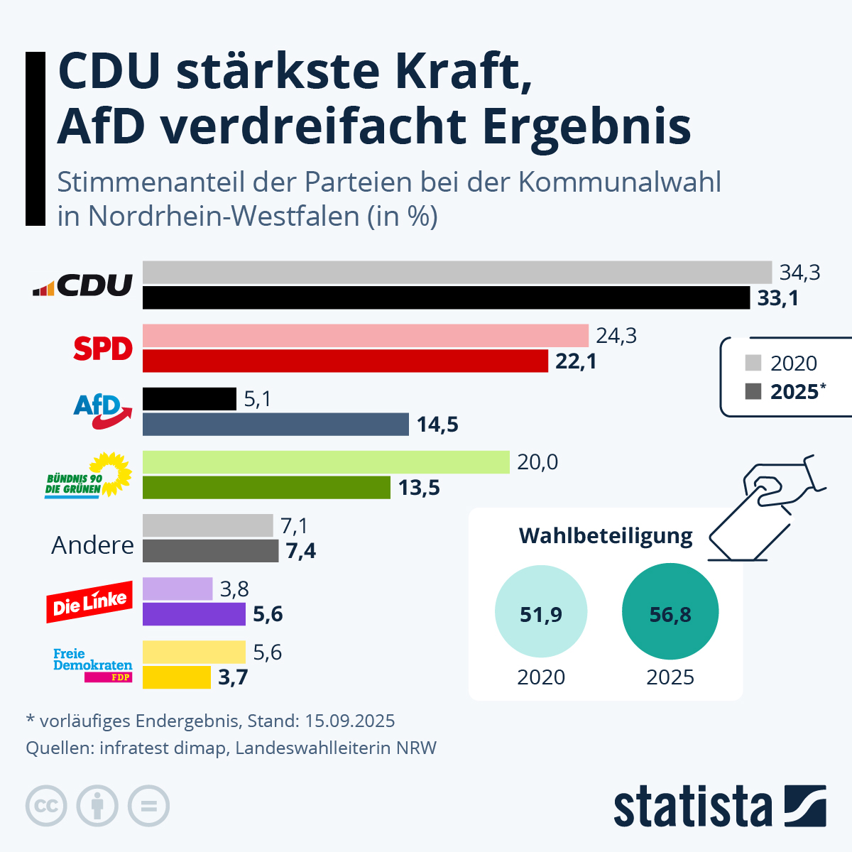 Die CDU ist als stärkste Kraft aus den Kommunalwahlen in Nordrheins-Westfalen hervorgegangen. Dahinter folgt die SPD auf dem zweiten Platz. Ein Grund zum Jubeln ist das nicht. Für beide Parteien war es das "schlechteste Kommunalwahlergebnis seit Gründung des Landes NRW im Jahr 1946," schreibt wdr.de. Ungetrübt gute Stimmung dagegen bei der AfD, die in Teilen als rechtsextrem eingestufte Partei konnte ihr Ergebnis im Vergleich zum Wahlgang 2020 fast verdreifachen. Dazu CDU-Ministerpräsident Wüst: "Dieses Ergebnis muss uns zu denken geben, kann uns auch nicht ruhig schlafen lassen." Felix Banaszak Bundesvorsitzender der Grünen bewertete den Wahlausgang als "Ausdruck einer doch recht fundamentalen Verschiebung der politischen Lage". Eine Verschiebung die sich für seine Partei mit einem Minus von 6,5 Prozentpunkten manifestiert. Und auch die FDP steht im Vergleich zu 2020 deutlich schlechter da. Freuen durften sich die Linken, die als einzige Partei neben der AfD ihren Stimmenanteil ausbauen konnte.