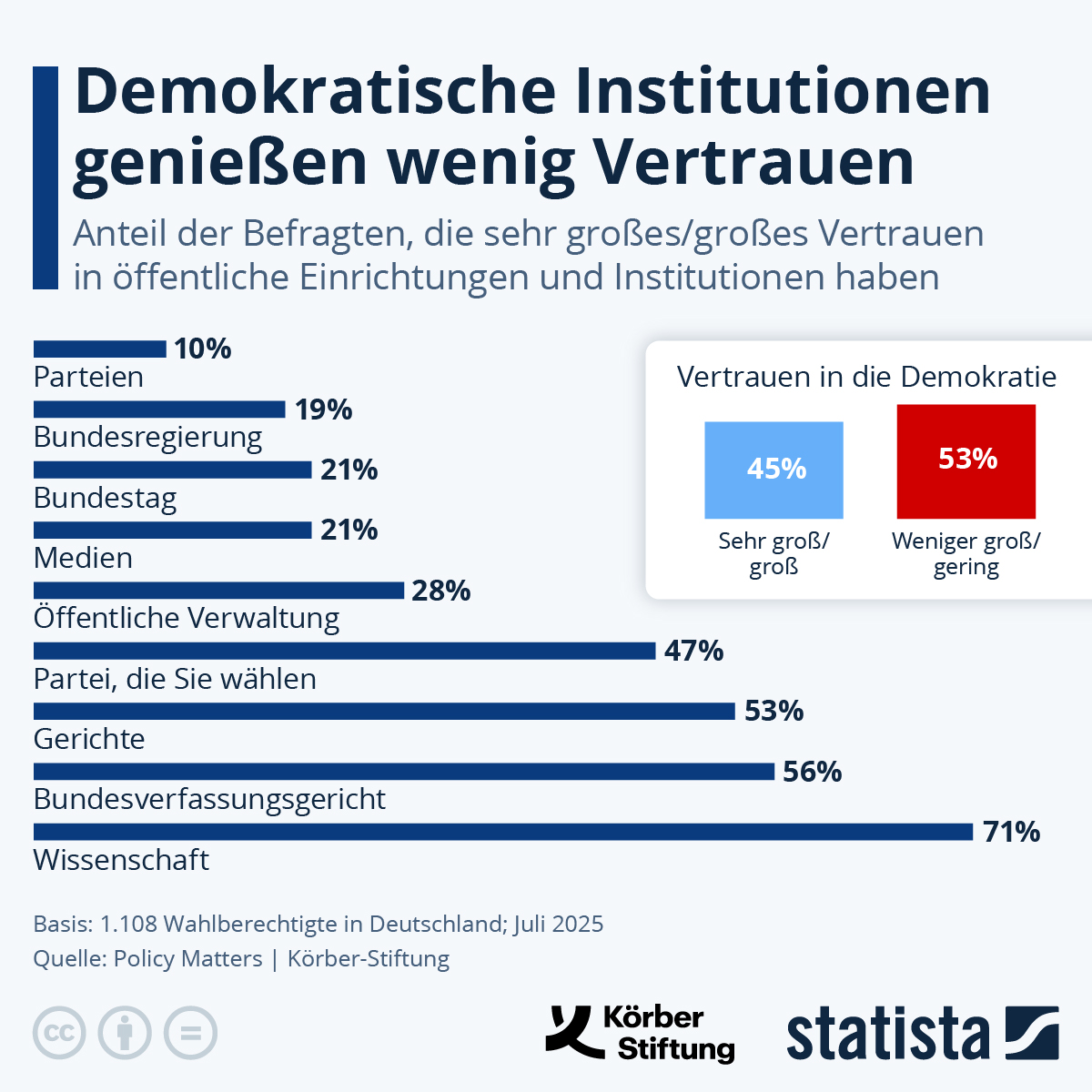 53 Prozent der Wahlberechtigten haben weniger großes oder geringes Vertrauen in die Demokratie. Das geht aus der kürzlich von Policy Matters im Auftrag der Körber Stiftung erhobenen Studie "Demokratie in der Krise 2025" hervor. Dazu passend ist es um das Vertrauen in öffentliche Einrichtungen und Institutionen schlecht bestellt. So gibt nur jede:r zehnte Befragte an, sehr großes oder großes Vertrauen in Parteien im Allgemeinen zu haben. Auch Bundesregierung und Bundestag sind mit einem erheblichen Vertrauensdefizit konfrontiert, wie der Blick auf die Statista-Grafik zeigt. Sven Tetzlaff, Leiter des Bereichs Demokratie und Zusammenhalt der Körber-Stiftung, ordnet die Ergebnisse folgendermaßen ein: "Die Umfrage zeigt: Viele Menschen sind verunsichert. Sie verlieren Vertrauen in Demokratie und Wirtschaft, fürchten um ihre Freiheit und misstrauen der Kontrolle staatlicher Macht."