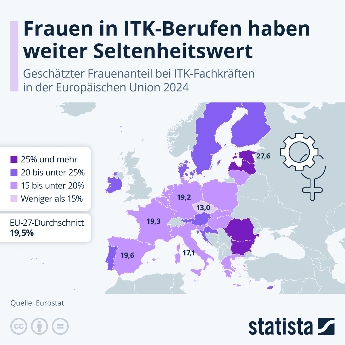 Zehn Millionen Fachkräfte arbeiten EU-weit im Bereich Informations- und Kommunikationstechnologie (ITK) - davon über zwei Millionen in Deutschland. Das geht aus einem Eurostat-Bericht zur Beschäftigung im ITK-Bereich hervor. Etwas mehr als 80 Prozent dieser Beschäftigten sind Männer. Hierzulande arbeiten insgesamt etwas mehr als 436.000 ITK-Spezialistinnen - das entspricht einem Frauenanteil von 19,2 Prozent. Damit liegt die Bundesrepublik knapp unter dem EU-Durchschnitt. Vergleichsweise stark vertreten sind weibliche ITK-Fachkräfte in Estland, Rumänien und Bulgarien (jeweils mindestens 27 Prozent. Dagegen sind Frauen in Ungarn, Malta und Tschechien besonders stark unterrepräsentiert.