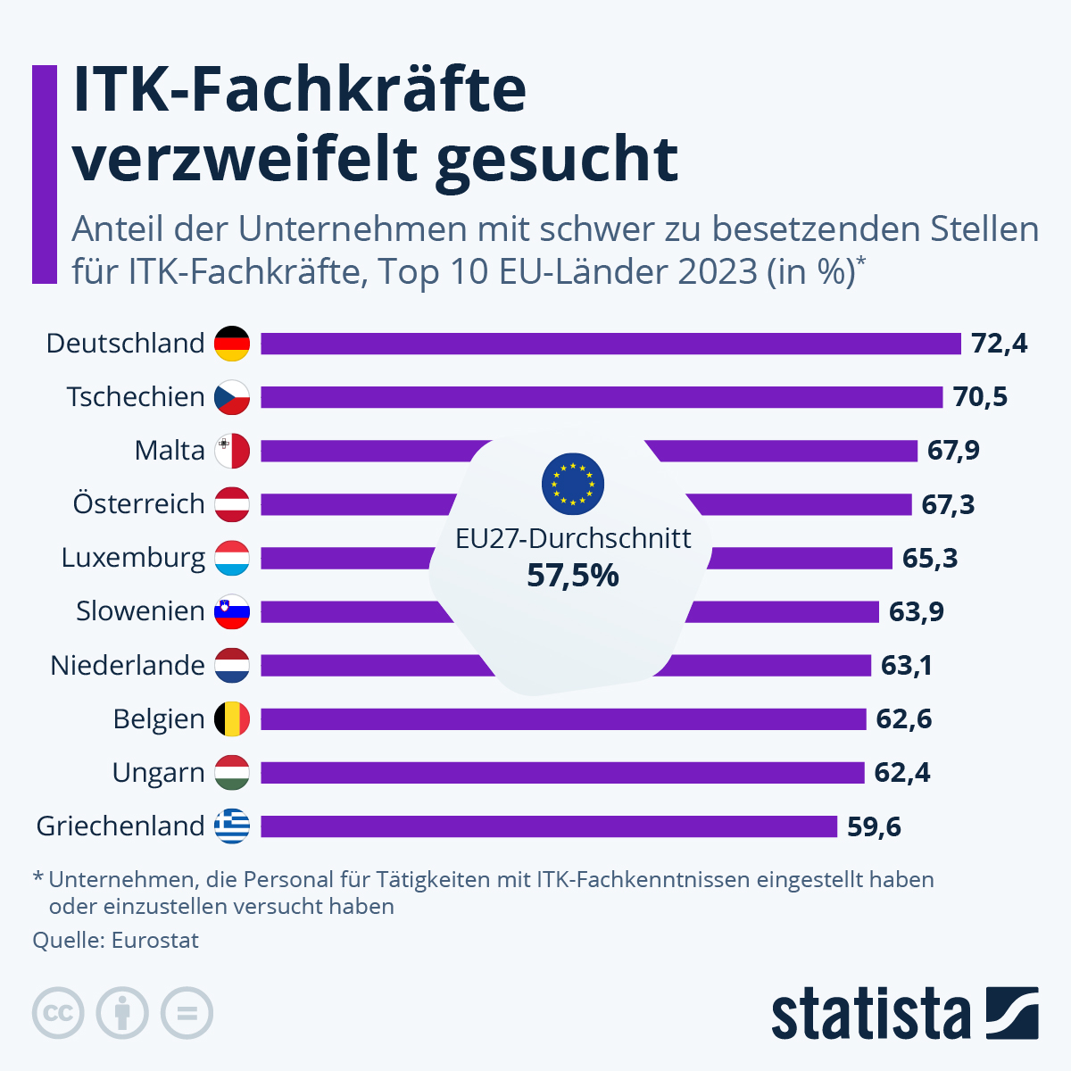 72,4 Prozent der Unternehmen, die hierzulande Personal für Tätigkeiten mit ITK-Fachkenntnissen suchen, haben laut einem Eurostat-Bericht Probleme geeignetes Personal zu finden. Damit liegt Deutschland satte 15 Prozent über dem EU-Durchschnitt, wie der Blick auf die Statista-Grafik zeigt. Ein ähnlich ausgeprägtes ITK-Personalproblem hat ansonsten nur noch Tschechien. In absoluten Zahlen ausgedrückt fehlen hierzulande laut Bitkom 109.000. Bis eine ausgeschriebene IT-Stelle besetz werden kann, vergehen laut einer Umfrage des Branchenverbands im Schnitt 7,7 Monate. Ganz so schlecht ist die Lage indes nicht überall. In Spanien und Norwegen haben beispielsweise nur jeweils knapp über 30 Prozent der rekrutierenden Unternehmen Schwierigkeiten damit, ITK-Stellen zu besetzen.