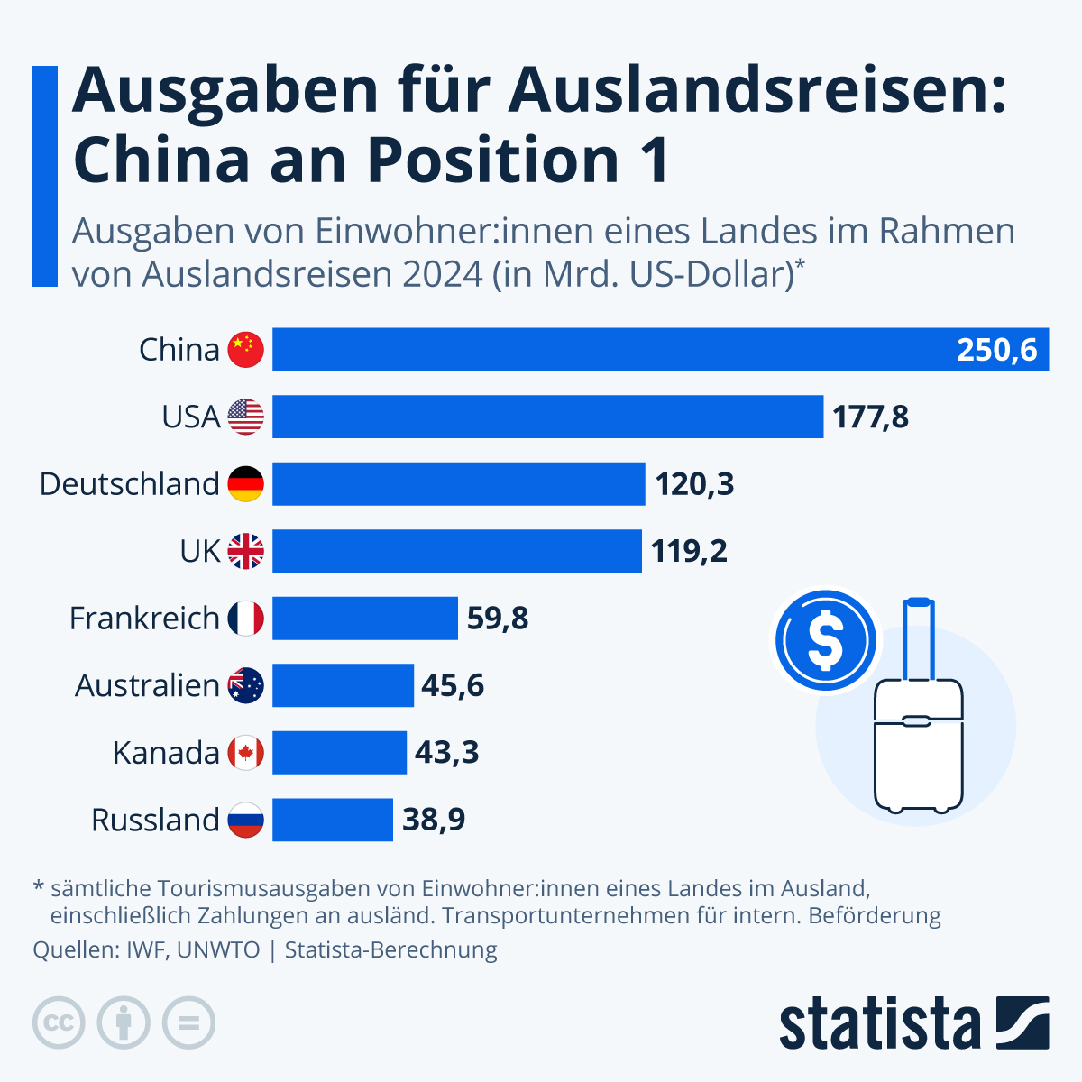 Touristen aus China geben bei ihren Auslandsreisen absoluten Zahlen zufolge am meisten Geld aus. Das zeigt die Statista-Infografik mit Daten der UNWTO. Im vergangenen Jahr lagen diese Ausgaben bei rund 250 Milliarden US-Dollar. Auch Russland befindet sich in der Liste der 10 Länder mit den höchsten Touristenausgaben. Auch deutsche Reisende sind starke Treiber der Touristenausgaben in anderen Ländern: mit rund 120 Milliarden US-Dollar liegen sie an Position drei des Rankings.