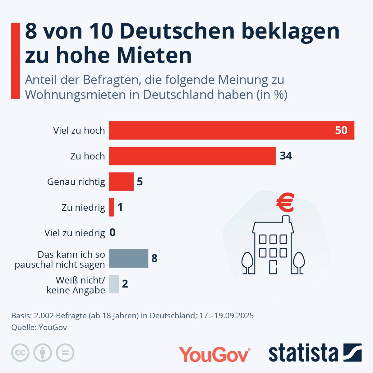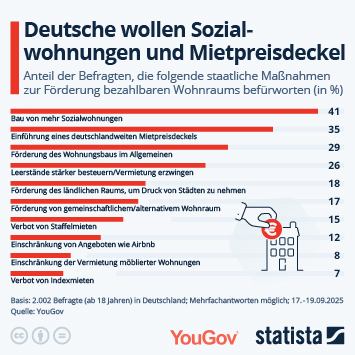 Acht von zehn Deutschen sind der Meinung, dass die Mieten zu hoch (34 Prozent) oder viel zu hoch (50 Prozent) sind. Das geht aus einer aktuellen Umfrage von YouGov und Statista hervor. Dass die Bundesbürger:innen damit richtig liegen, zeigen Presseberichte der letzten Monate: "Mieten in Deutschland explodieren" (Berliner Morgenpost, August), "Mietwohnungsmarkt bleibt extrem angespannt" (Spiegel Online, Juli), "Großstadt-Mieten seit 2015 um 50 Prozent gestiegen (Tagesschau, Juni). Der wohl wichtigste Grund für diese Entwicklung ist der Mangel an Wohnraum. Dessen Ursache ist wiederum, dass der Wohnungsbau in Deutschland laut Angaben des Statistischen Bundesamtes anhaltend das durch die Bundesregierung vorgegebene Ziel von 400.000 fertiggestellten Wohnungen pro Jahr deutlich verfehlt. Das hat konkrete Auswirkungen auf die Mieter:innen, wie eine weitere Frage zeigt.