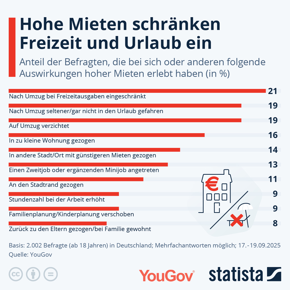Ein Fünftel der Teilnehmer:innen einer Umfrage von YouGov und Statista mussten sich nach einem Umzug finanziell einschränken oder kennen zumindest Menschen, bei denen das der Fall war. Dabei sind Frauen (25 Prozent) hier deutlich stärker betroffen als Männer (16 Prozent). Eine andere verbreitete Folgen hoher Mieten in Deutschland sind Einschränkungen bei der Urlaubsplanung. Ähnlich viele Befragte berichten davon, dass sie beziehungsweise Bekannte bereits aus Kostengründen auf einen Umzug verzichtet haben. Die steigenden Mieten führen außerdem dazu, dass Mieter:innen in billigere Gegenden oder an den Stadtrand ausweichen müssen, wie der Blick auf die Statista-Grafik zeigt. Vergleichsweise selten sind dagegen Auswirkungen auf die Familienplanung. Gefragt, was der Staat unternehmen sollte, um die Lage zu verbessern haben, favorisieren die Studienteilnehmer:innen eine Lösung.