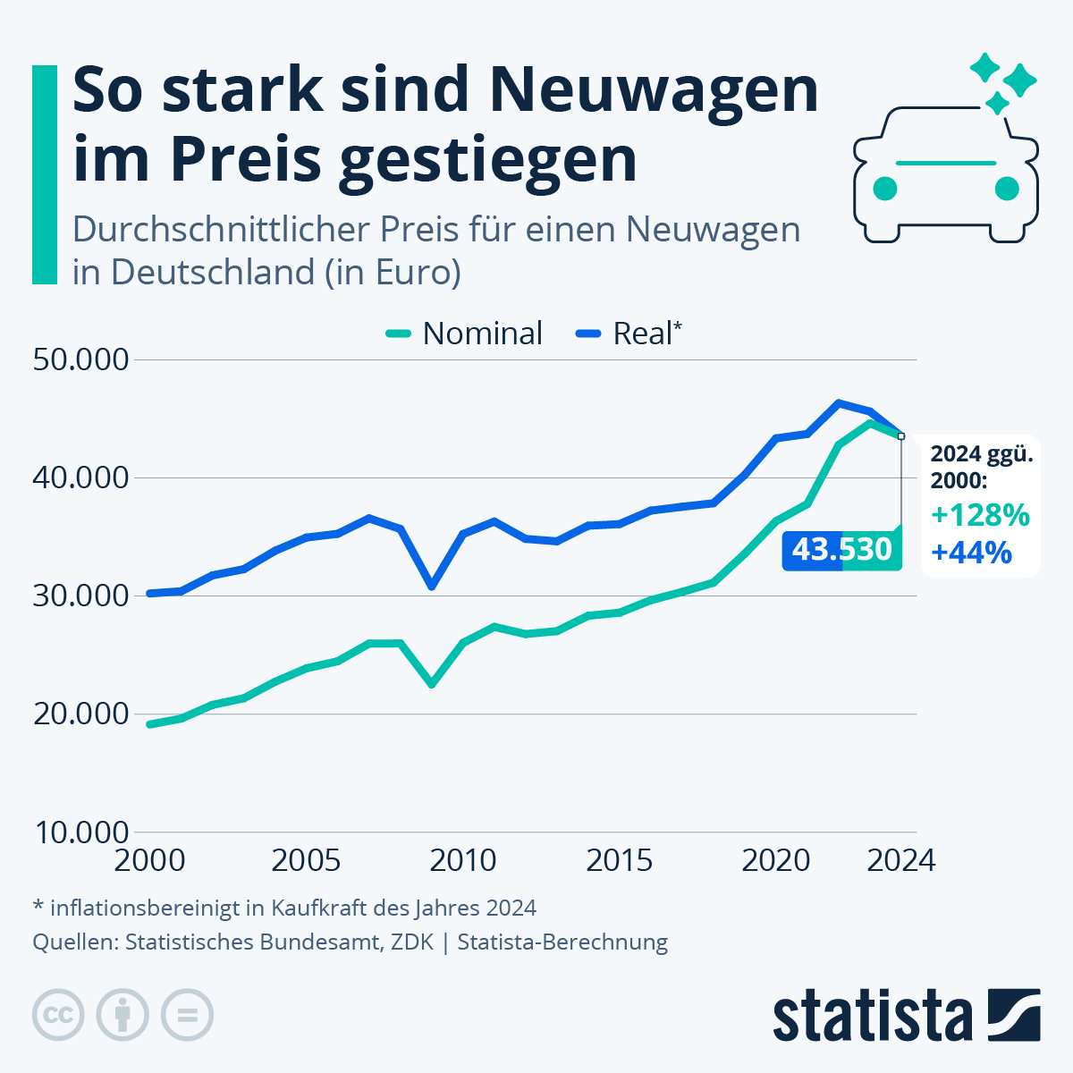 Eine Mischung aus höheren Produktionskosten, technologischen Anforderungen, regulatorischem Druck und Marktmechanismen hat dazu geführt, dass die Preise für neue Personenkraftwagen (Pkw) in Deutschland seit dem Jahr 2000 spürbar gestiegen sind. So lag der Durchschnittspreis für einen Neuwagen im Jahr 2000 nominal (nicht inflationsbereinigt) bei rund 19.000 Euro – bis 2024 ist er auf über 43.000 Euro gestiegen. Dies entspricht einer Steigerung von 128 Prozent, wie die Statista-Infografik mit Daten des Deutschen Kraftfahrzeuggewerbe Zentralverbands (PDF-Download) zeigt. Inflationsbereinigt liegt das Plus hingegen bei lediglich 44 Prozent. Die Verbraucherpreise sind im selben Zeitraum um 68 Prozent gestiegen. Die Preise für neue Pkw sind also in geringerem Maße gestiegen als die Verbraucherpreise insgesamt und als es die hohen nominalen Preise auf den ersten Blick vermuten lassen würden. Da die durchschnittlichen Preise im fünfstelligen Bereich liegen, fallen die Preissteigerungen den Verbrauchern in Deutschland jedoch vermutlich stärker auf als etwa bei Produkten wie Lebensmittel, Körperpflege und Reinigungsmittel.