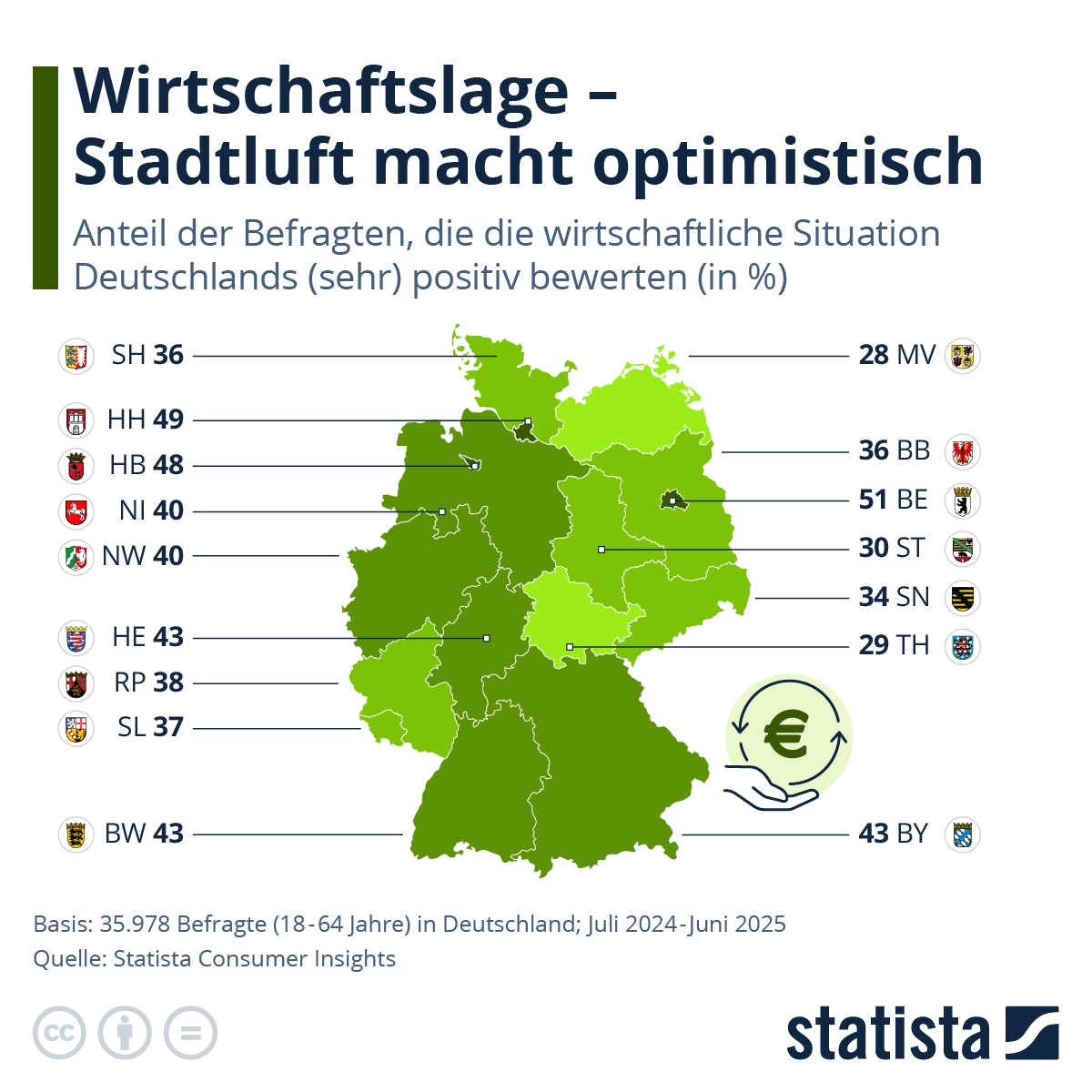 Die deutsche Wirtschaft ist laut Statistischem Bundesamt im ersten Quartal kaum gewachsen und im zweiten Quartal leicht geschrumpft. Das die konjunkturelle Lage in vielen Branchen eher mäßig ist, zeigt sich unter anderem an Plänen zum Abbau von Stellen, zum Beispiel in der Autobranche. Aber wie sehen die Deutschen eigentlich selbst die wirtschaftliche Situation ihres Landes? Laut Statista Consumer Insights haben 40 Prozent einen positiven Eindruck und 24 Prozent einen negativen. Etwas mehr als ein Drittel der Befragten sagen weder noch beziehungsweise trauen sich keine Einschätzung zu. Besonders optimistisch geben sich die Einwohner:innen der Stadtstaaten Berlin, Hamburg und Bremen, wie der Blick auf die Statista-Karte zeigt. Dagegen schätzen die Menschen im Osten der Republik die Lage weniger positiv einschätzen ein.