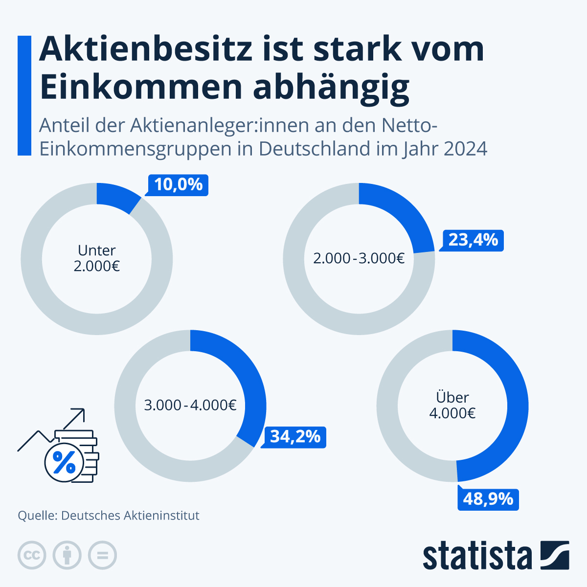 Je höher das Einkommen, desto verbreiteter ist in Deutschland der Besitz von Aktien. Das zeigt die Statista-Grafik mit Daten des Deutschen Aktieninstituts (DAI). So ist jeder Zweite mit einem Netto-Einkommen von über 4.000 Euro im Monat am Aktienmarkt aktiv. Bei einem Einkommen von unter 2.000 Euro ist es hingegen nur jeder Zehnte. Ein Grund dafür könnte sein, dass Menschen mit geringerem Einkommen möglicherweise fürchten, Verluste nicht ausgleichen zu können und aus diesem Grund riskante wirkende Anlageformen wie Aktien eher meiden.