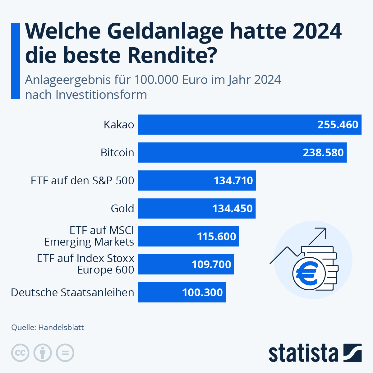 Wer Anfang des Jahres 2024 einen Betrag von 100.000 Euro in Bitcoin angelegt hat, hatte am Ende des Jahres 238.580 Euro auf dem Konto. Das ist das Ergebnis einer Erhebung des Handelsblatts. Übertroffen wird diese hohe Rendite nur vom Rohstoff Kakao. In den letzten zehn Jahren blieben die Kakaopreise relativ konstant. Der jüngste Rückgang der Produktionsmengen hat jedoch zu einer Störung der Weltmärkte und zu einem starken Preisanstieg geführt. Die größten kakaoproduzierenden Länder liegen in Westafrika - Côte d'Ivoire, Ghana, Nigeria und Kamerun - und liefern zusammen etwa 65 Prozent der weltweiten Kakaobohnen.