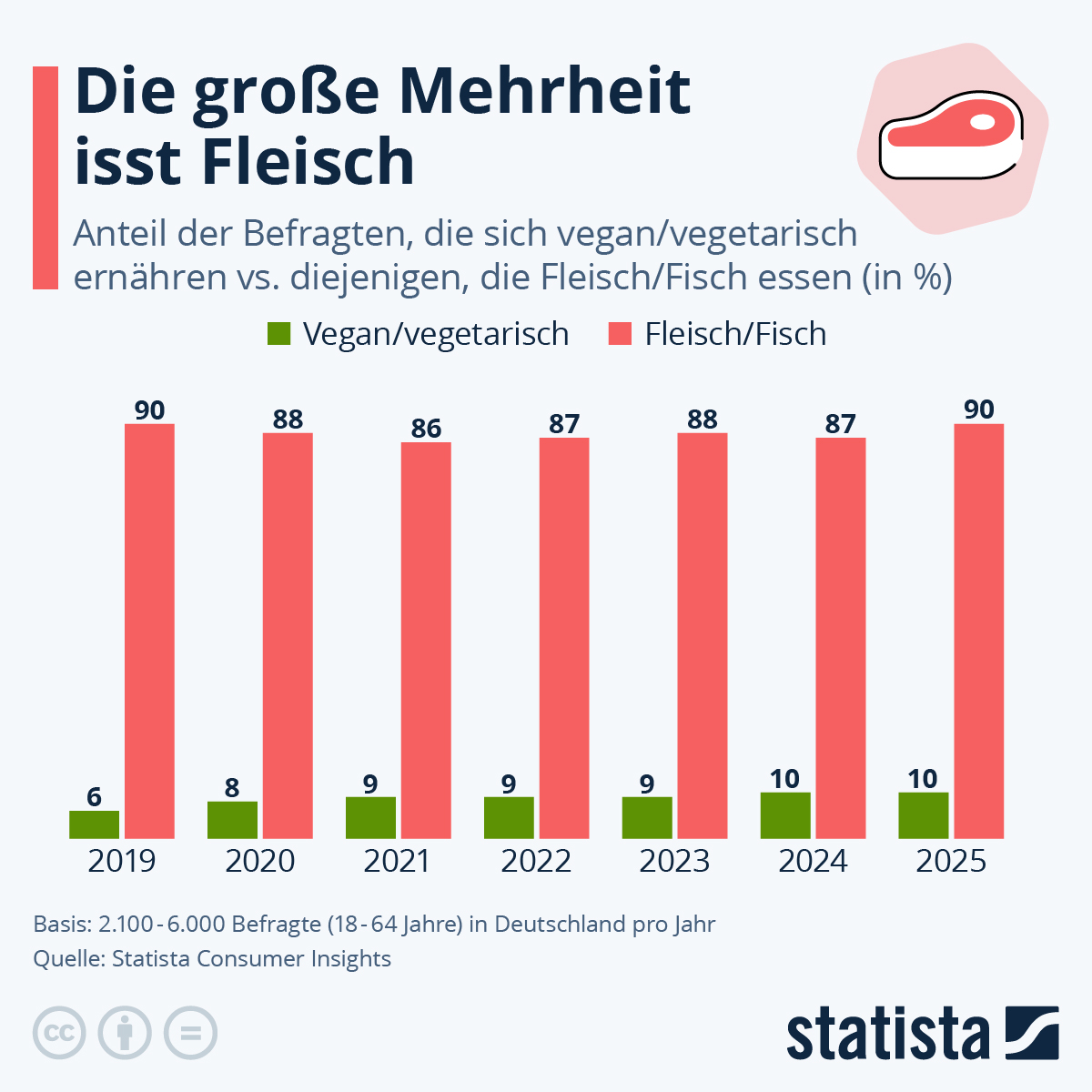 Die Statista Consumer Insights zeigen, wie verbreitet einzelne Ernährungsweisen in Deutschland sind. Demnach isst etwa ein Zehntel der Befragten vegan oder vegetarisch. Dieser Wert ist den vergangenen Jahren tendenziell gestiegen, wie der Blick auf die Statista-Grafik zeigt. Stabil geblieben ist dagegen der Anteil der Fleischesser:innen. Zuletzt gaben 90 Prozent der Umfrageteilnehmer:innen an, Fleisch und Fisch zu konsumieren.