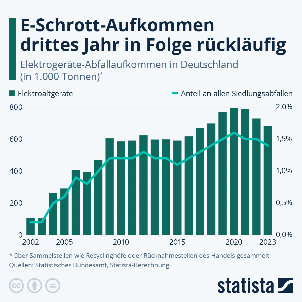 Das Abfallaufkommen an Elektroaltgeräten in Deutschland ist im dritten Jahr rückläufig. Wie die Statista-Infografik mit Daten des Statistischen Bundesamts (Excel-Download) zeigt, liegt die Menge, die über Sammelstellen wie Recyclinghöfe oder Rücknahmestellen des Handels gesammelt worden ist, im Jahr 2023 bei 681.000 Tonnen. Im Jahr 2020 hatte sie mit 795.000 Tonnen noch einen Rekordstand erreicht. Von 2002 bis 2009 hatte es einen steilen Anstieg dieser Abfälle gegeben, bis 2016 gab es eine Plateauphase und bis 2020 wieder einen deutlichen Anstieg.
