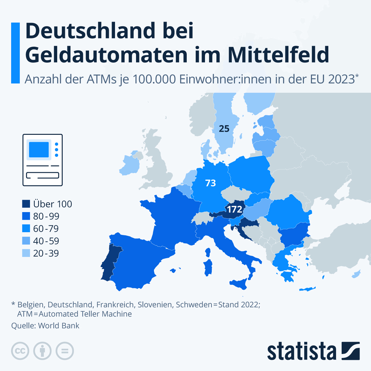 In Deutschland ist das bezahlen mit Münzen und Scheinen noch weit verbreitet, wie die Statista Consumer Insights zeigen. Dagegen macht Bargeld in Schweden nur noch rund 0,9 Prozent des Bruttoinlandsprodukts aus. Das hat den Nebeneffekt, dass es in dem skandinavischen Land immer weniger Geldautomaten gibt. Der World Bank zufolge kommen dort auf 100.000 Einwohner:innen nur noch 25 Bankomaten. Zum Vergleich in Deutschland sind es 73. Aber auch hier ist die Zahl der Geldausgabemaschinen rückläufig, wie tagesschau.de erst im Juli berichtete. Auch einer Umfrage der Deutschen Bundesbank zufolge gestaltet sich der Zugang zu Bargeld schwieriger. Solche Probleme dürften den Österreicher:innen eher fremd sein. Nirgendwo in der EU kommen auf 100.000 Einwohner:innen mehr Geldautomaten.