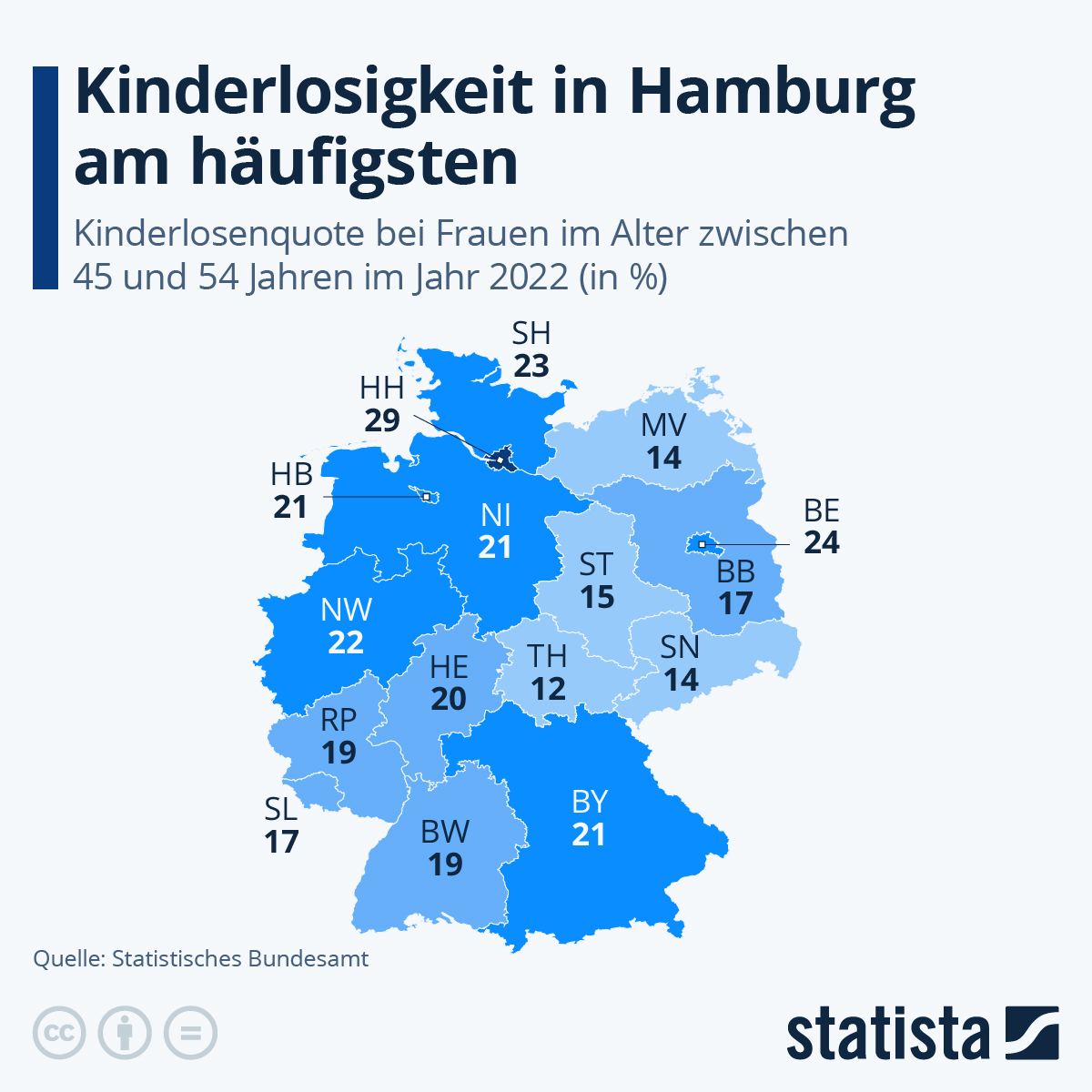 Kinderlosigkeit ist bei Frauen in Hamburg am weitesten verbreitet. Hier liegt die Kinderlosenquote von Frauen im Alter von 45 bis 54 Jahre mit 29 Prozent an der Spitze des Bundesländervergleichs. An zweiter Stelle folgt Berlin mit 24 Prozent. Das zeigt die Statista-Infografik mit Daten des Statistischen Bundesamts. Hohe Lebenshaltungskosten, ein hoher Anteil an alleinlebenden Menschen oder Bildungs- und Karriereprioritäten können dazu beitragen, dass Kinderlosigkeit in den beiden bevölkerungsreichsten Städten am weitesten verbreitet sind. Am geringsten sind die Quoten dagegen in Ostdeutschland und im Saarland. Die Gründe für Kinderlosigkeit können freiwillig sein, wie die Ablehnung der Verantwortung oder die Priorisierung anderer Lebensziele. Zu den unfreiwilligen Gründen können unter anderem medizinische Ursachen zählen.
