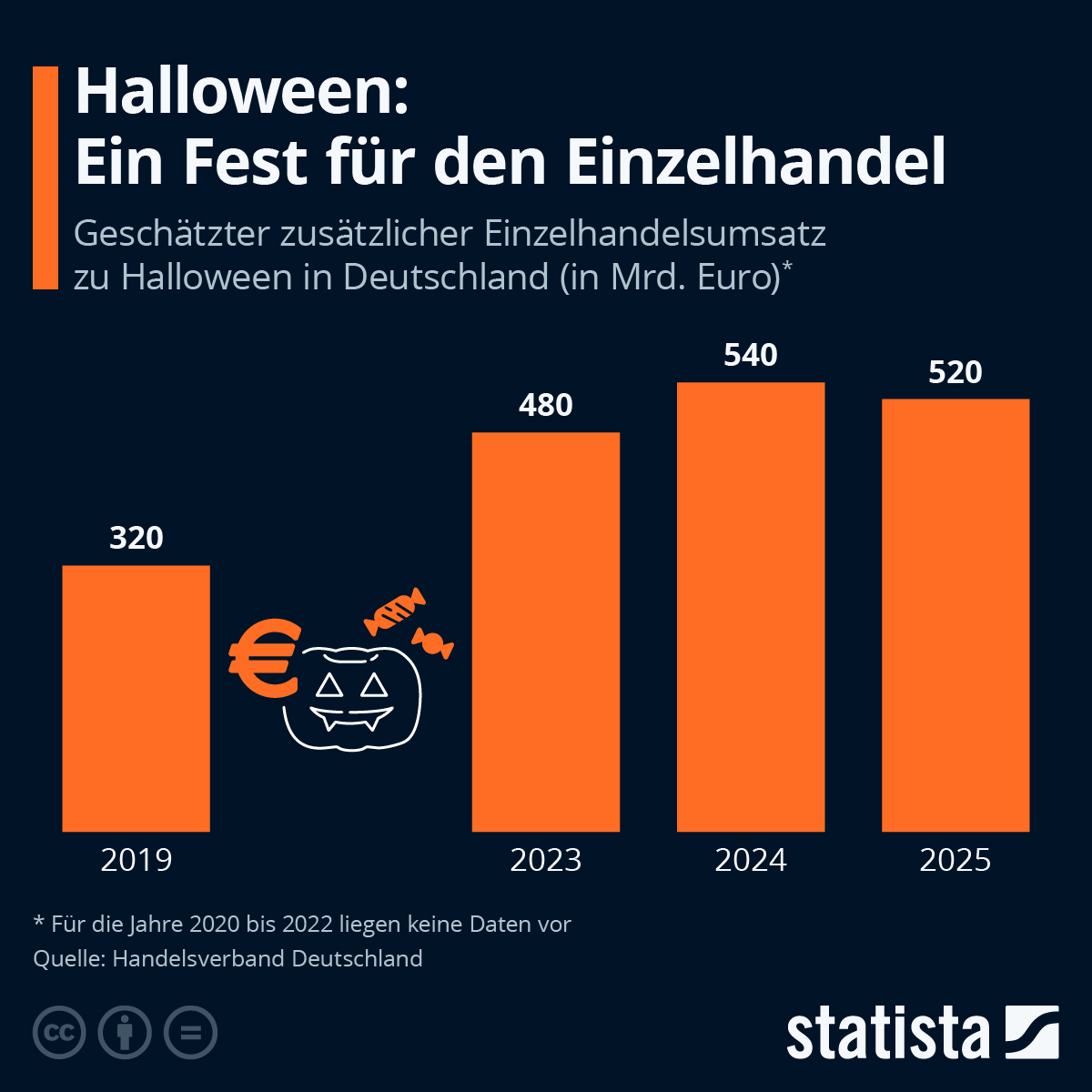 Laut einer Schätzung des Deutschen Handelsverbandes werden Verbraucher:innen in Deutschland in diesem Jahr rund 520 Million Euro für die Halloween-Feierlichkeiten ausgeben, was einen leichten Rückgang gegenüber dem Vorjahr bedeuten würde. Angesichts der eher zurückhaltenden Konsumstimmung insgesamt deutet der Handelsverband dies als Zeichen der Stabilität, liegen die Ausgaben damit doch immer noch mehr als 60 Prozent höher als 2019.