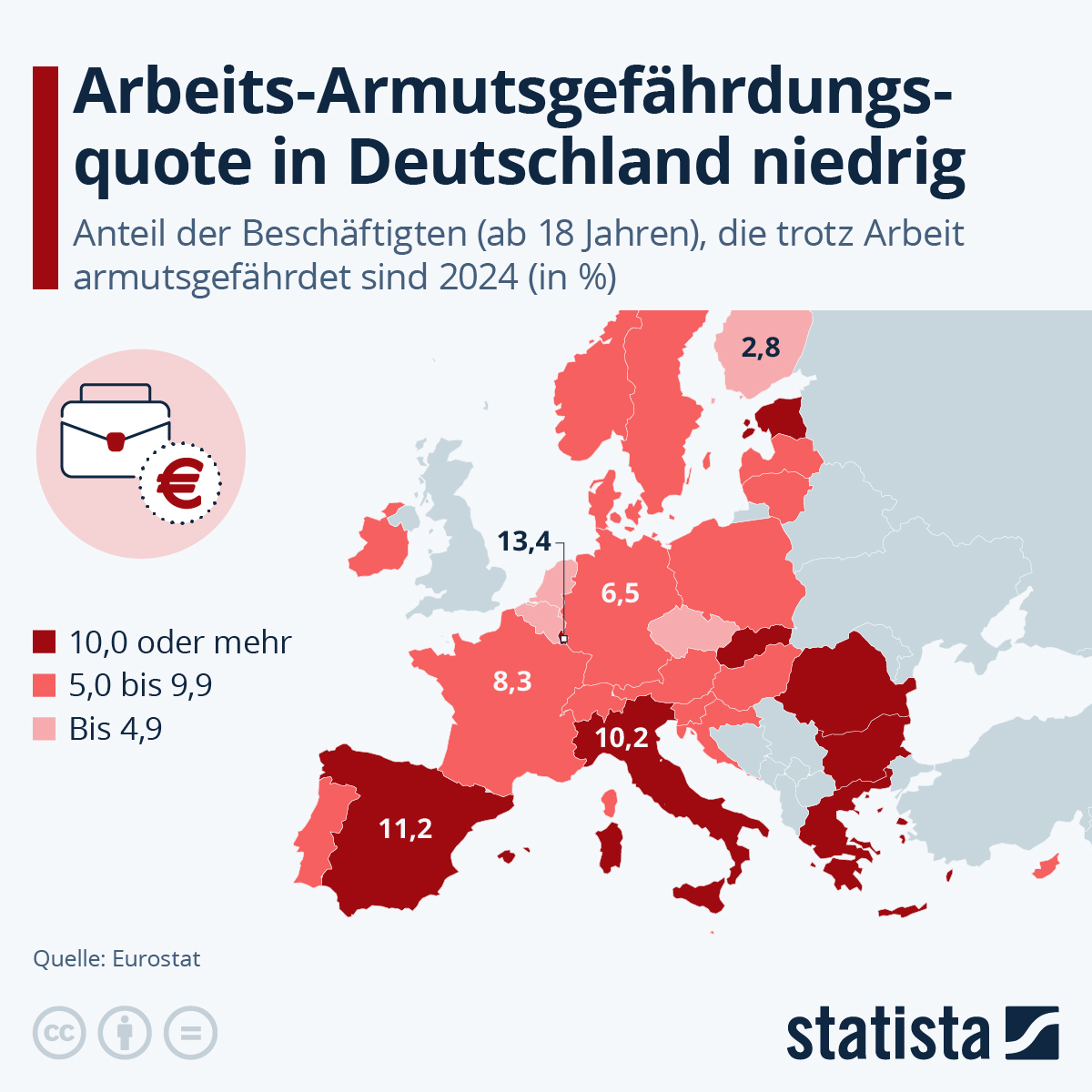 6,5 Prozent der erwachsenen Beschäftigten in Deutschland sind trotz Arbeit armutsgefährdet. Das geht aus einer aktuellen Veröffentlichung des Statistikamtes der Europäischen Union (Eurostat) hervor. Damit liegt diese Kennzahl einerseits unterhalb des EU-Durchschnitts. Andererseits ist der Wert im vergangenen Jahrzehnt auch deutlich zurückgegangen. Zum Vergleich: 2014 lag er noch bei rund zehn Prozent. Am höchsten ist die Arbeits-Armutsgefährdungsquote mit über 13 Prozent in Luxemburg. Die niedrigste Quote verzeichnet dagegen Finnland mit 2,8 Prozent. In 22 EU-Ländern sind Frauen eher trotz Erwerbstätigkeit von Armut bedroht, wobei der geschlechtsspezifische Unterschied in Rumänien am ausgeprägtesten ist (8,1 Prozentpunkte).
