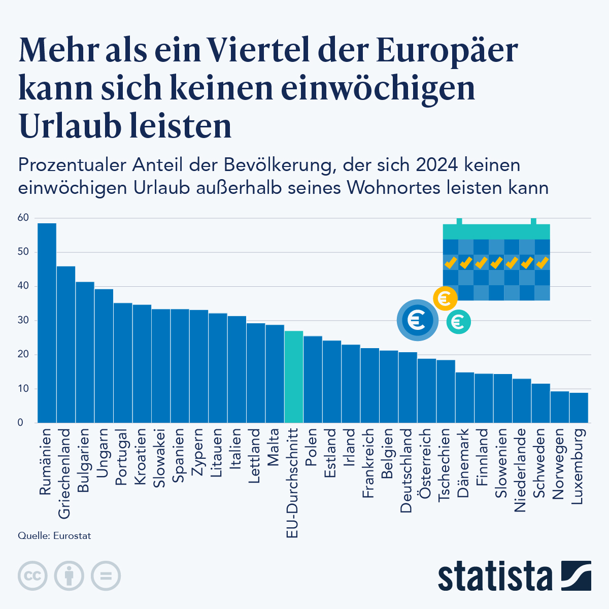 Diese Infografik zeigt den Anteil der Europäer, die sich keinen einwöchigen Urlaub leisten können, nach Ländern.