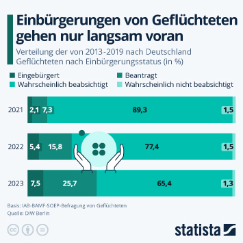 Mit zunehmender Aufenthaltsdauer steigt die Erwerbstätigkeit von syrischen Geflüchteten in Deutschland deutlich an. So belief sich bei den in Syrien geborenen Geflüchteten die Erwerbstätigenquote im ersten Jahr nach dem Zuzug auf unter zehn Prozent. Nach sieben Jahren Aufenthalt erhöhte sie sich auf rund 61 Prozent. Das zeigt die Statista-Infografik mit Daten des Instituts für Arbeitsmarkt- und Berufsforschung (IAB). Zum Vergleich: die durchschnittliche Erwerbstätigenquote der deutschen Gesamtbevölkerung liegt dem Statistischen Bundesamt zufolge im Jahr 2023 bei 77 Prozent. Die Experten des IAB gehen davon aus, dass im weiteren Zeitverlauf von einer weiteren Annäherung an das Niveau der einheimischen Bevölkerung auszugehen ist.