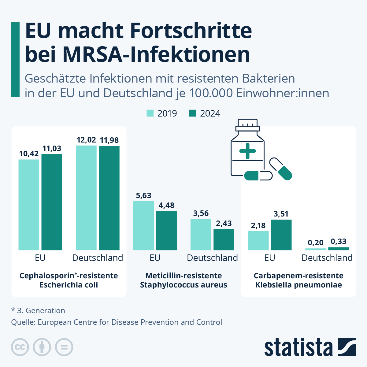 Ein aktueller Bericht der European Centre for Disease Prevention and Control macht deutlich, dass Antibiotika-Resistenzen in der Europäischen Union (EU) ein anhaltend großes Problem sind. Es gibt aber auch Fortschritte zu vermelden. Im Jahr 2024 lag die geschätzte Gesamtinzidenz von Infektionen durch Methicillin-resistente Staphylococcus aureus (MRSA) in der EU bei 4,48 pro 100.000 Einwohner:innen - damit ist dieser Wert innerhalb von fünf Jahren um über 20 Prozent zurückgegangen. In Deutschland liegt die Zahl der MRSA-Infektionen mit 2,43 nochmal deutlich niedriger. Indes stagnieren die Ansteckungszahlen bei Cephalosporin-resistenten Escherichia coli und Carbapenem-resistenten Klebsiella pneumoniae, wie der Blick auf die Statista-Grafik zeigt. Letztere Bakterienart spielt allerdings in Deutschland kaum eine Rolle.