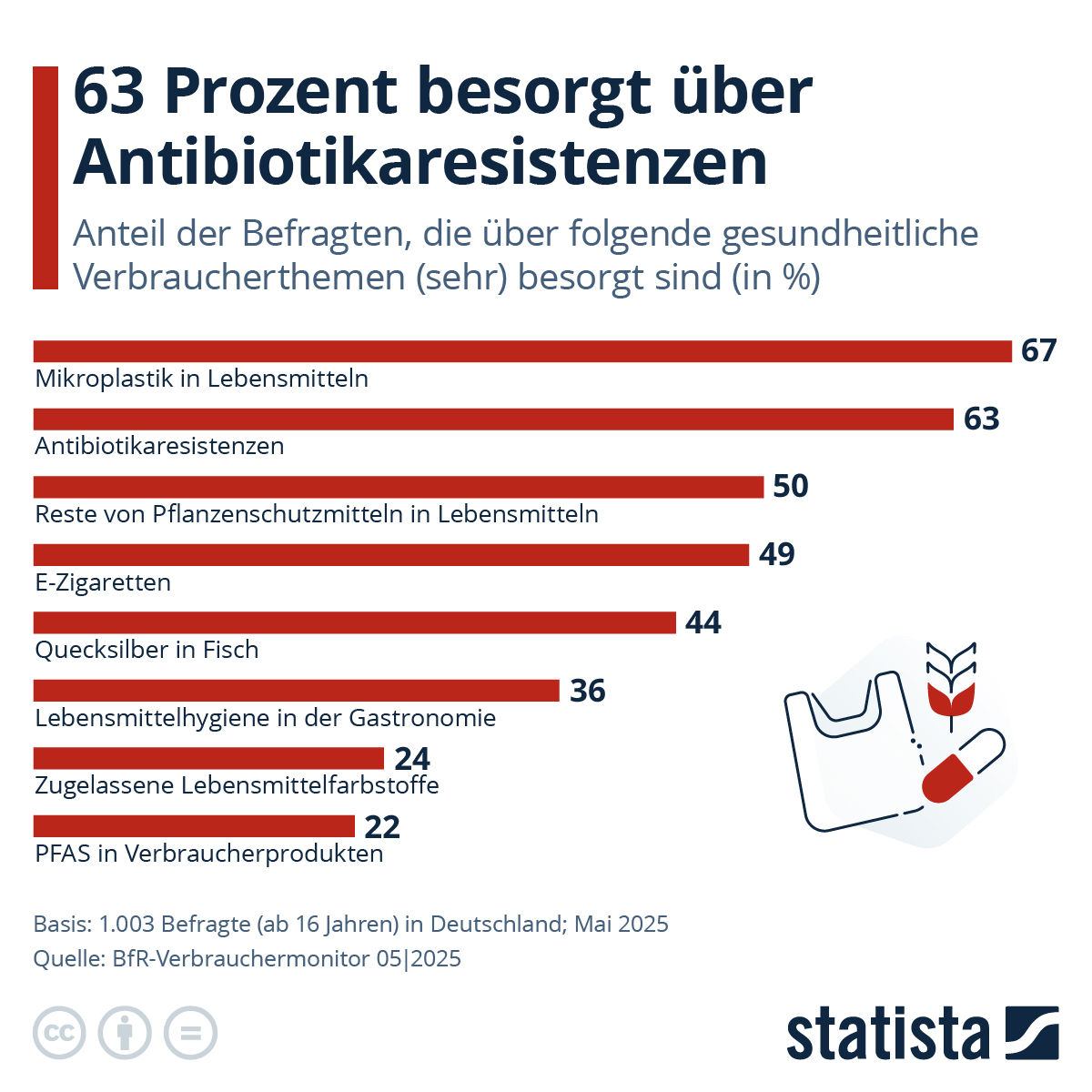63 Prozent der im Auftrag des Bundesinstituts für Risikobewertung befragten Verbraucher:innen sorgen sich um Antibiotikaresistenzen. Nur Mikroplastik beschäftigt die Menschen hierzulande noch mehr, wie der Blick auf die Statista-Grafik zeigt. Tatsächlich sind resistente Erreger in Deutschland und der Europäischen Union (EU) laut European Centre for Disease Prevention and Control ein weit verbreitetes Problem. Ursächlich hierfür sind der übermäßige Einsatz von Antibiotika in der Tier- und Human-Medizin. Aktuell droht die EU ihr selbst gesetztes Ziel zur Reduzierung des Einsatzes dieser Medikamenteklasse zu verfehlen - und auch in Deutschland ist der Verbrauch zuletzt wieder gestiegen.