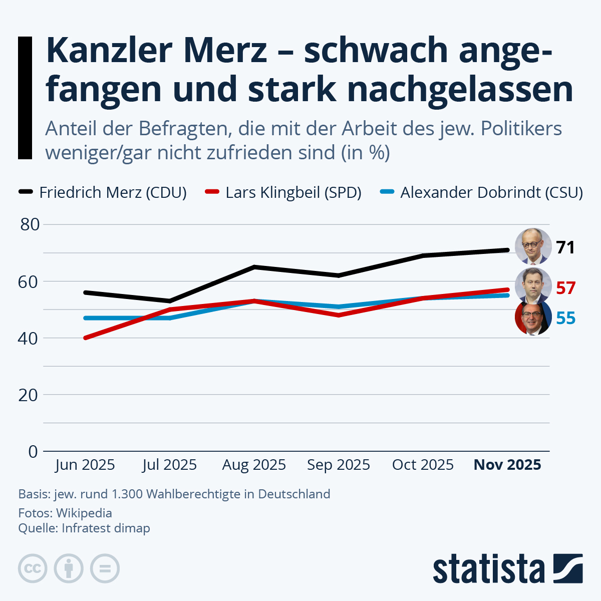 Friedrich Merz kurze Amtszeit als Bundeskanzler ist bereits jetzt reich an kontrovers diskutierten Themen. Nach Stadtbild-Debatte und Renten-Debatte folgte zuletzt eine Brasilien-Debatte. Gleichzeitig sitzt der Union der rechtsextreme Konkurrenz im Nacken - Union und AfD liegen schon seit geraumer Zeit in den Umfragen gleichauf. Bei den Bundesbürger:innen haben die von Merz ausgelösten Debatten ebenfalls Eindruck hinterlassen, wie die Ergebnisse der letzten ARD-DeutschlandTRENDs zeigen. Bereits im Mai sprachen 59 Prozent der Befragten dem Sauerländer die Kanzlereignung ab. Seitdem ist Merz in der Wähler:innengunst weiter gesunken. Anfang November waren 71 Prozent der Befragten mit dessen Arbeit weniger oder gar nicht zufrieden. Zum Vergleich: Amtsvorgänger Olaf Scholz (SPD) brauchte für eine ähnlich schlechte Bewertung fast zwei Jahre. Dagegen schneiden Lars Klingbeil (SPD) und Alexander Dobrindt noch verhältnismäßig gut ab, wie der Blick auf die Statista-Grafik zeigt.