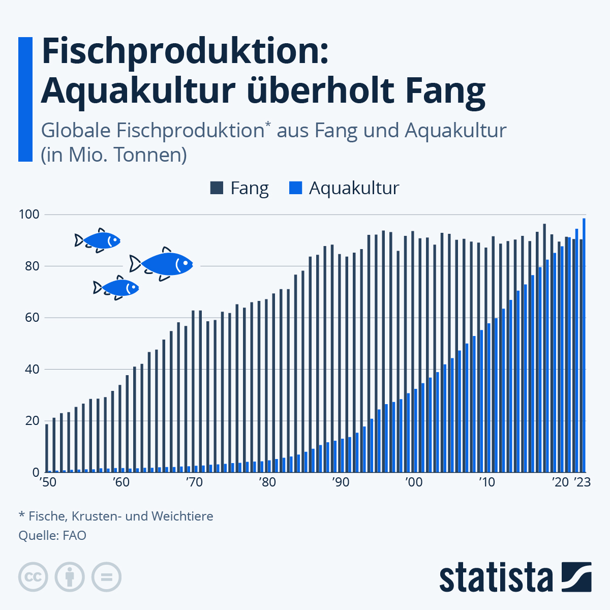 Weltweit wird heute mehr Fisch in Aquakultur produziert als in Meeren und Binnengewässern gefangen wird. Das zeigt die Statista-Infografik mit Daten der Food and Agriculture Organization der United Nations (FAO). So lag die Fischproduktion aus Aquakultur im Jahr 2023 bei 98,5 Millionen Tonnen, aus Wildfang hingegen bei 90,4 Millionen Tonnen. Dies entspricht einem Anteil an der gesamten Fischproduktion von 52 Prozent. Im Jahr 1950 lag der Aquakultur-Anteil lediglich bei drei Prozent. Die Daten beinhalten Fische, Krusten- und Weichtiere.